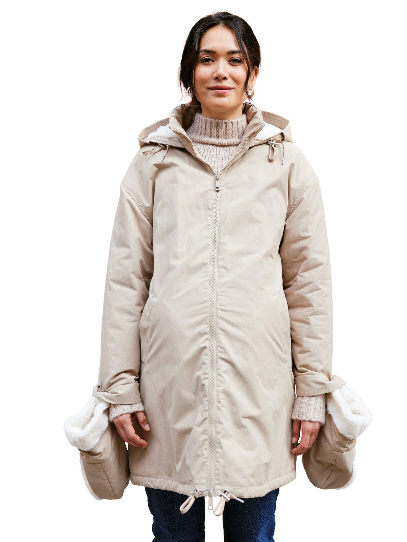 Details: Für Schwangerschaft und Elternzeit Gefütterte Kapuze Stehkragen mit Bindebändern und dekorativen Druckknöpfen Reißverschluss vorn 2 Taschen Tunnelzug mit Stoppern hinten am Saum Abnehmbarer Einsatz für das Baby im Tragetuch oder in der Babytrage: Mit Kapuze und Teddyfleece-Futter. Befestigung mit Reißverschlüssen. Fäustlinge: Abnehmbar. Weiches Webpelz-Futter. Zum Schieben des Kinderwagens geeignet.