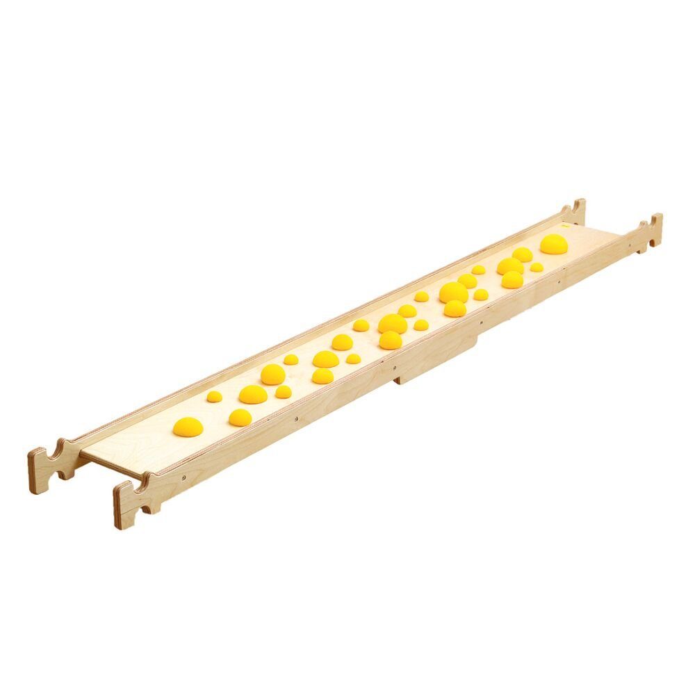 Das Balancierbrett von Erzi ist aus stabilem Birkenschichtholz hergestellt. Auf der Oberfläche sind Schaumstoffbälle eingelassen, die die taktile Wahrnehmung fördern. Hier ist Geschicklichkeit gefragt, damit alle Bälle in ihrer Position bleiben. Durch das Laufen auf dem Fußballen bietet der Waldboden eine gute Möglichkeit, sicheres Gehen auf unebenen Untergründen zu trainieren.