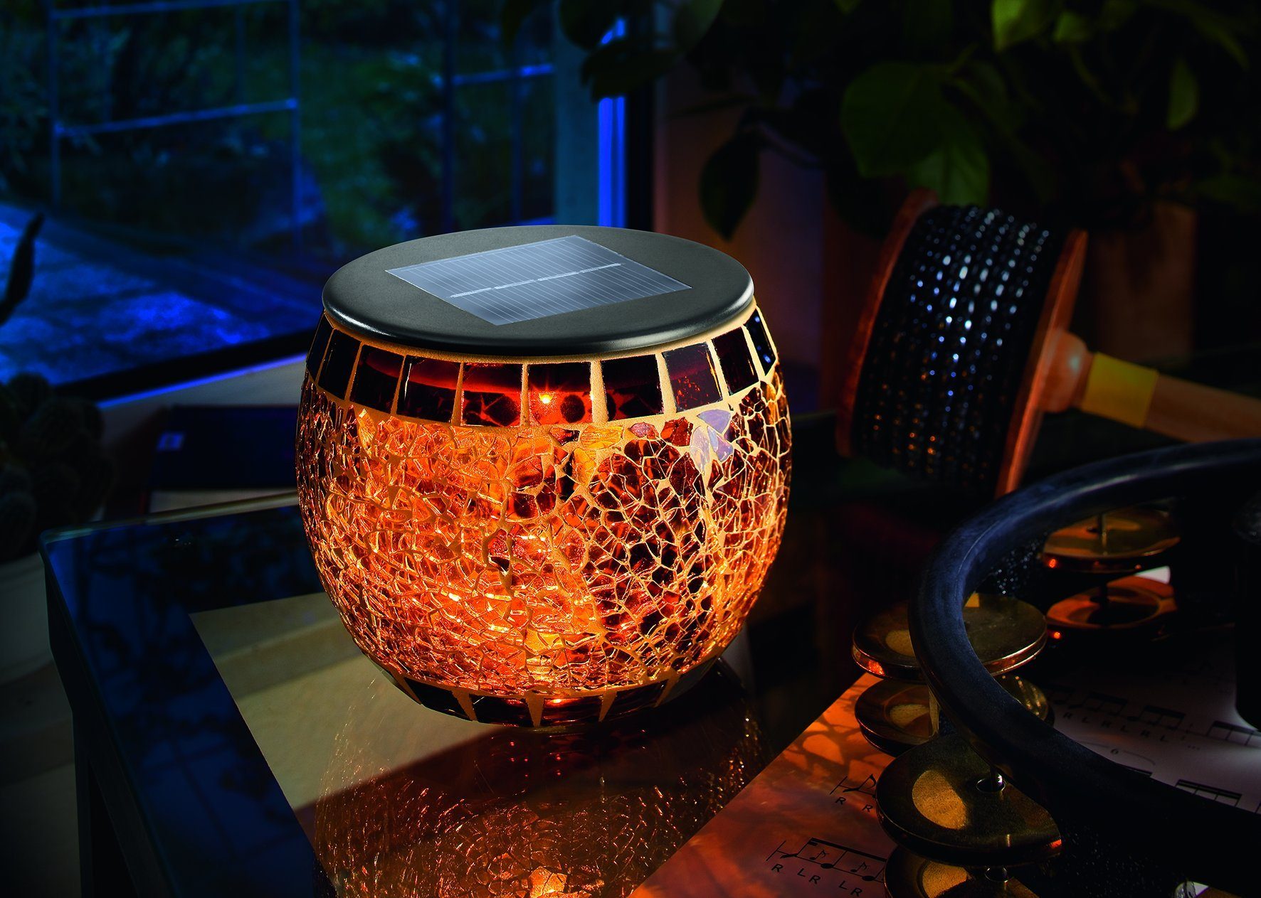 So künstlerisch die Glasverarbeitung, so ausgefeilt die Technik, die für den Betrieb durch Sonnenenergie sorgt. Erstmaliges Anschalten genügt, und das im Deckel integrierte Solarmodul erzeugt aus auftreffendem Sonnenlicht Strom, der im Akku gespeichert wird.