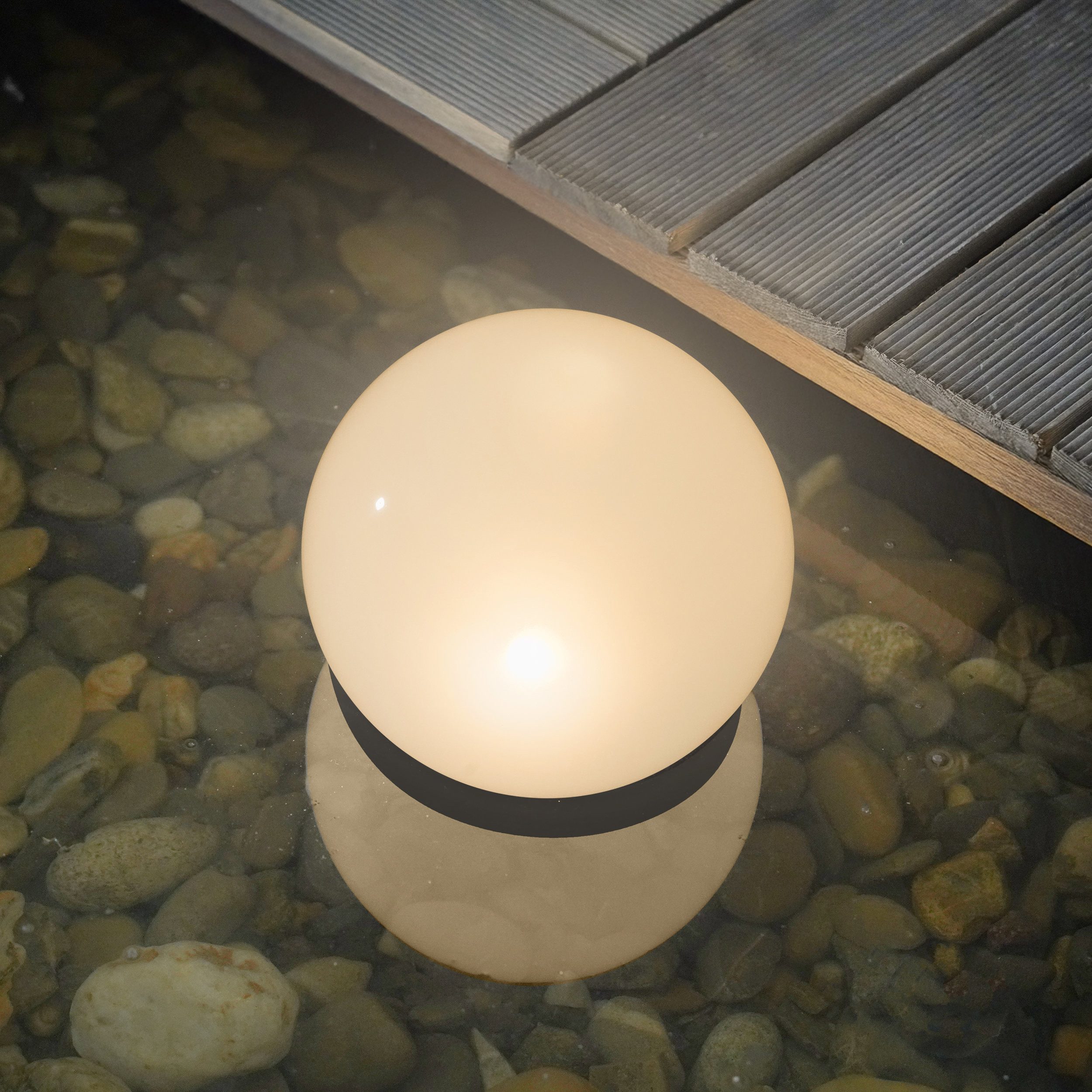 | Lieferumfang | 1 x Leuchtkugel komplett mit Akku, 1 x IR-Fernbedienung inkl. Batterie, 2 x Erdspieße, 1 x Metallbügel für Bodenmontage |