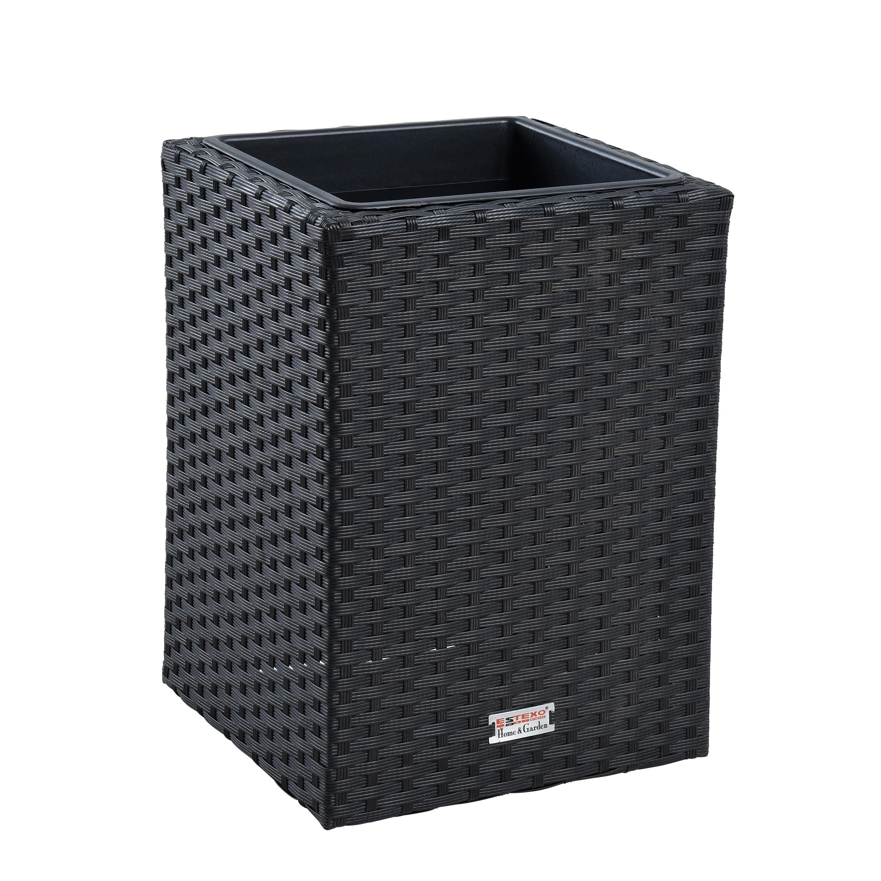 Material Gestell: Metall mit Polyrattan Umrandung Material Blumentöpfe: Kunststoff Maße gesamt (LxBxH): 30 cm x 30 cm x 40 cm oder 60 cm Maße Einsatz (LxBxH): 26 cm x 26 cm x 24 cm Rattan Farbe: Schwarz, Anthrazit-Grau, Grau-Mix, Beige-Braun oder Beige wählbar
