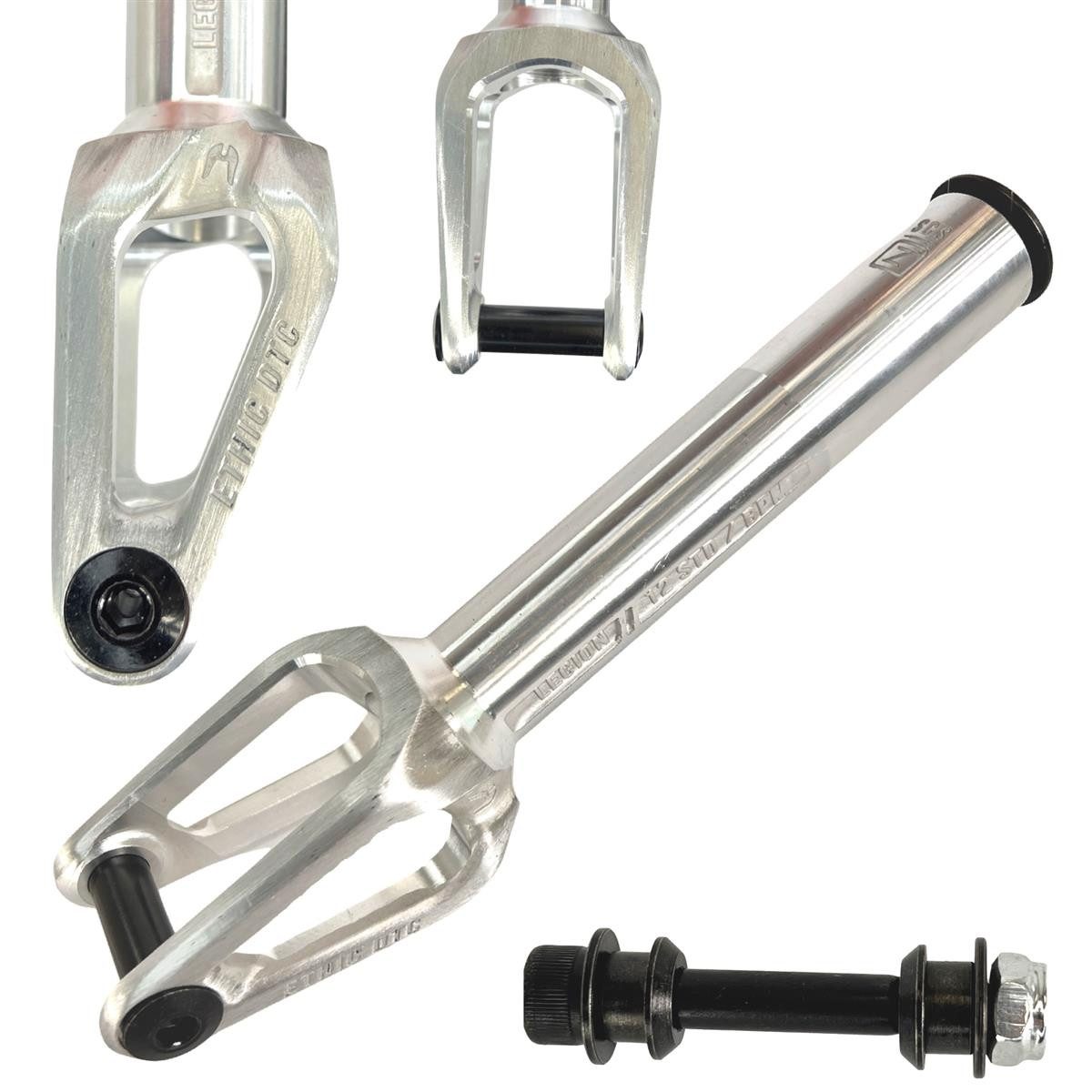 Die neue Ethic V2 12STD Stunt-Scooter Gabel ist die zweite Generation der 12STD Version des beliebten Klassikers. Nach 6 Jahren der Pause haben die Entwickler bei Ethic nun eine optimierte Version der beliebten Gabel auf den Markt gebracht. Die Legion V2 12STD besteht anders als ihr Vorgänger nicht aus der Aluminiumlegierung Aluminium 6061 sondern aus dem noch stärkeren und hochdichten Aluminium 7075. Dadurch ist die Gabel um 74% stabiler und haltbarer als zuvor. Zusätzlich konnte durch einen Angepassten Herstellungsprozess das Gewicht um 17% auf 218g reduziert werden. Zusammen mit der Achse und Kompressionsschraube wiegt die Gabel insgesamt 281g. Die Gabelarme wurden nachträglich CNC gefräst um Gewicht zu sparen und eine glatte und elegante Optik zu erzeugen. Die Schaftlänge beträgt 14cm. Die Gabel ist Kompatibel mit Rollen mit einem Achsendurchmesser von 12mm und 8mm sowie bis maximal 125mm x 30mm Größe. Sie ist kompatibel mit dem SCS Kompressionssystem. Die SCS Gabel kann mit jedem Lenker (Titan, Alu, Stahl (oversized/standard) unabhängig von dessen Innendurchmesser gefahren werden. Dies liegt daran dass beim SCS-System die Klemme die Kompatibilität bestimmt. Für eine SCS-Gabel bedarf es eine SCS-Klemme. Die weitere Kompatibilität eines Lenkers mit dieser Klemme entscheidet der Innendurchmesser der Klemme, bzw. der Außendurchmesser des Lenkers!