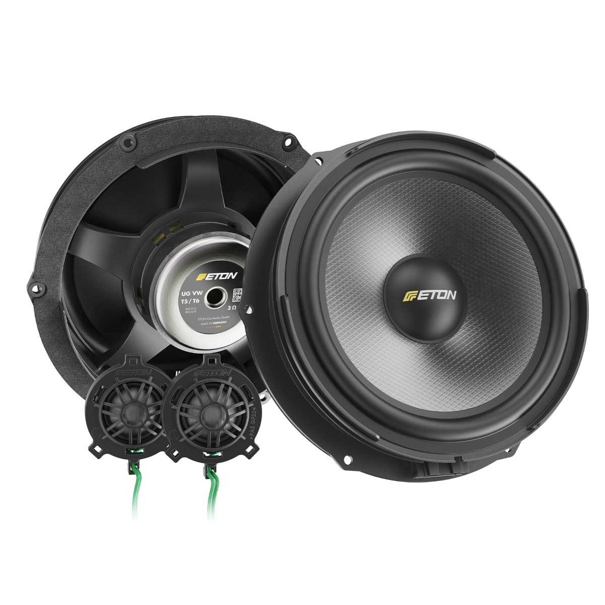 Das UG VW T6 F2.2 ist ein neu entwickeltes 200 mm (8“) Plug & Play 2-Wege Komponenten Front-System für den VW T6, bestehend aus speziell abgestimmten Tief-/Mitteltönern mit Glasfaser-Papier Sandwichmembran, Langhub-Sicke, belastbarer Spule und äußerst