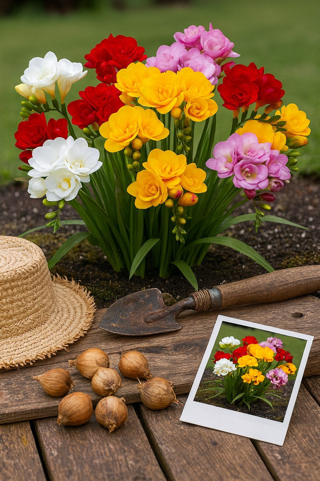 Die gefüllten Freesien sind besonders für ihre intensiven, warmen Duftnoten bekannt, die sich an sonnigen Tagen sanft im Garten oder auf der Terrasse ausbreiten. Der Mix vereint verschiedene leuchtende Farben, die gemeinsam ein harmonisches und lebendiges Gesamtbild schaffen.