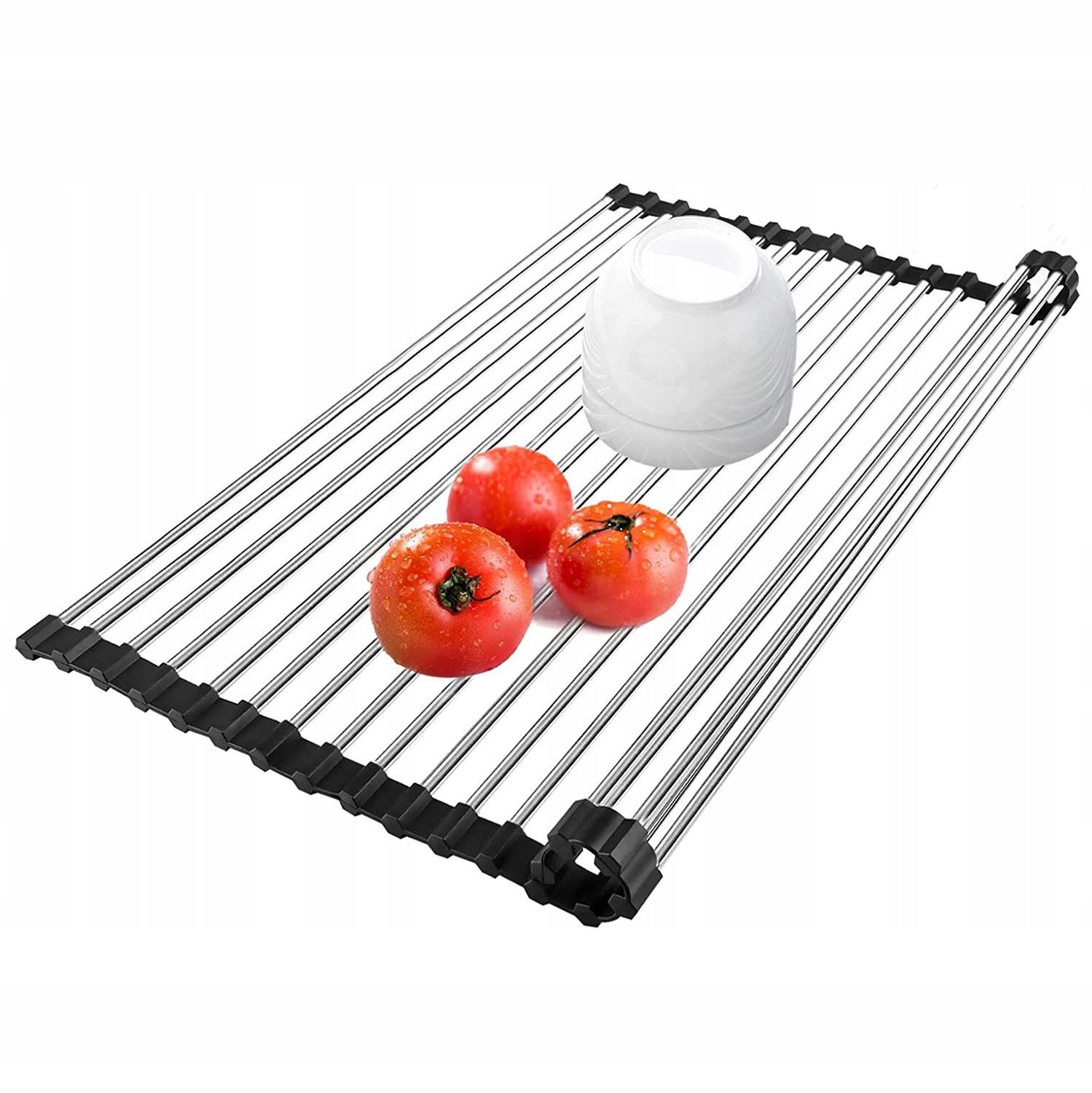 Rostbeständiges Edelstahlgitter mit Silikon RändernDas praktische Küchenzubehör fügt sich dank dem modernen Design in jeden Küchenstil ein. Es wurde speziell entworfen, um Ihnen bei der Organisation und das schnelle Abtrocknen Ihres Geschirrs und Bestecks zu helfen. Das Gitter besteht aus langlebigem und rostbeständigem Edelstahl SUS 304. Der Geschirrabtropfer ist BPA-frei, thermoresistent und hält bis zu 100 °C. Perfekt für heiße Pfannen oder Backbleche direkt aus dem Ofen. Die Verwendung von Silikon an den Enden des Gitters bietet zusätzlichen Schutz für empfindliche Geschirrteile und verhindert Kratzer auf der Spüle und das Verrutschen des Gitters.