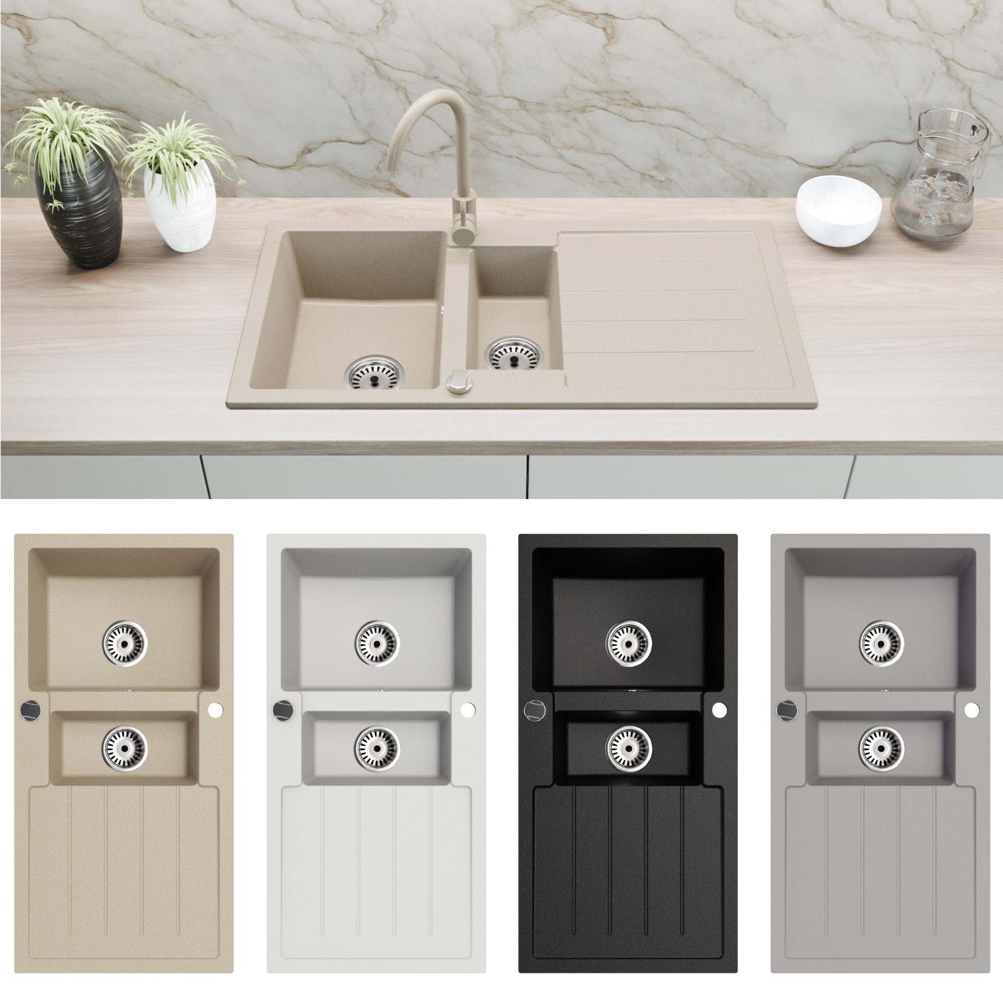 Granitspüle Spülbecken Küchenspüle Einbauspüle 100x50 cm 2 Becken mit Abtropffläche inklusive Zubehör-Set