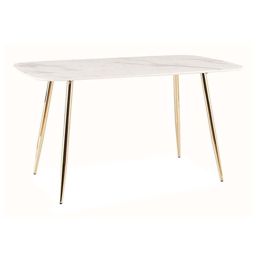 Der moderne Esstisch in einer harmonischen Farbkombination lässt sich hervorragend mit anderen Möbeln dieser Serie kombinieren. Die Tischplatte dieses Designertisches besteht aus einer Kombination aus gehärtetem Glas und MDF in Marmor-Optik.