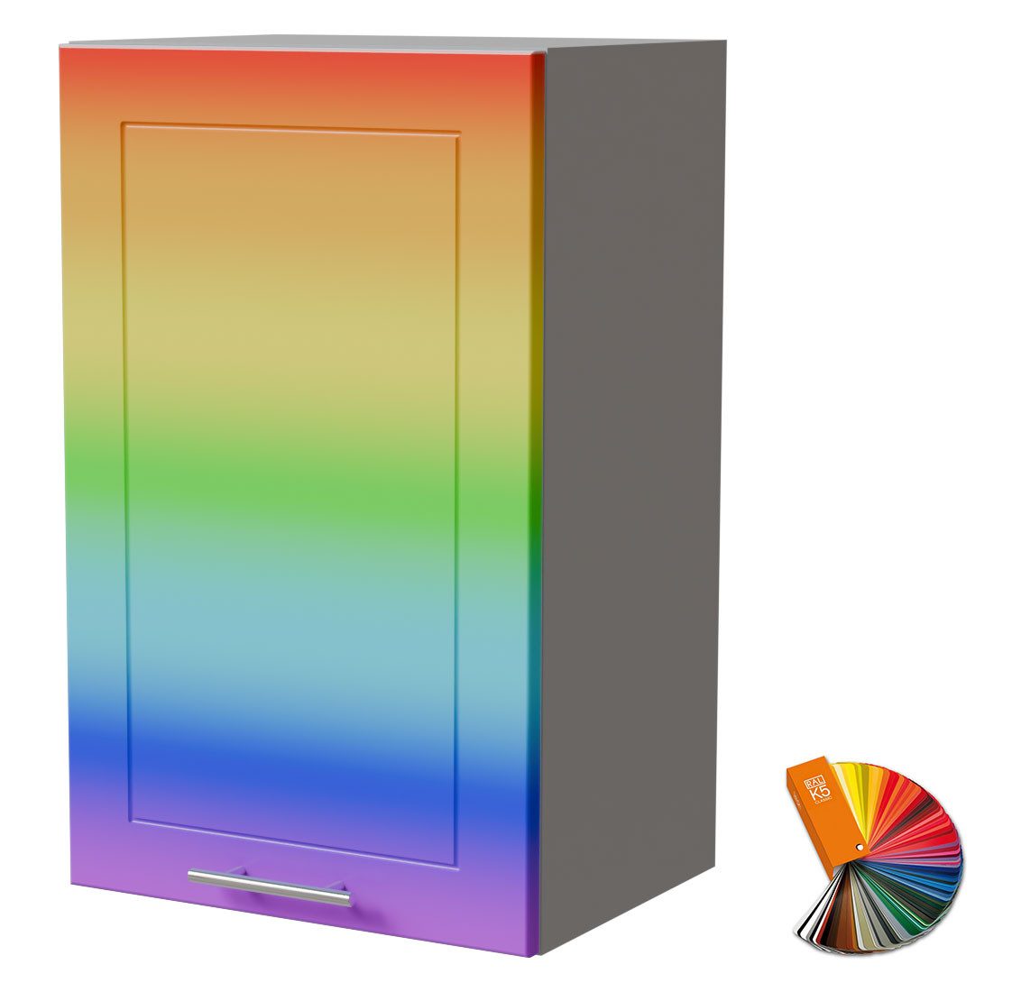 Bitte beachten Sie: Die regenbogenfarbene Schrankfront ist nicht bestellbar. Diese dient lediglich zur Darstellung der Farbenvielfalt, in der dieser Schrank, basierend auf dem K5-Farbfächer, bestellbar ist.