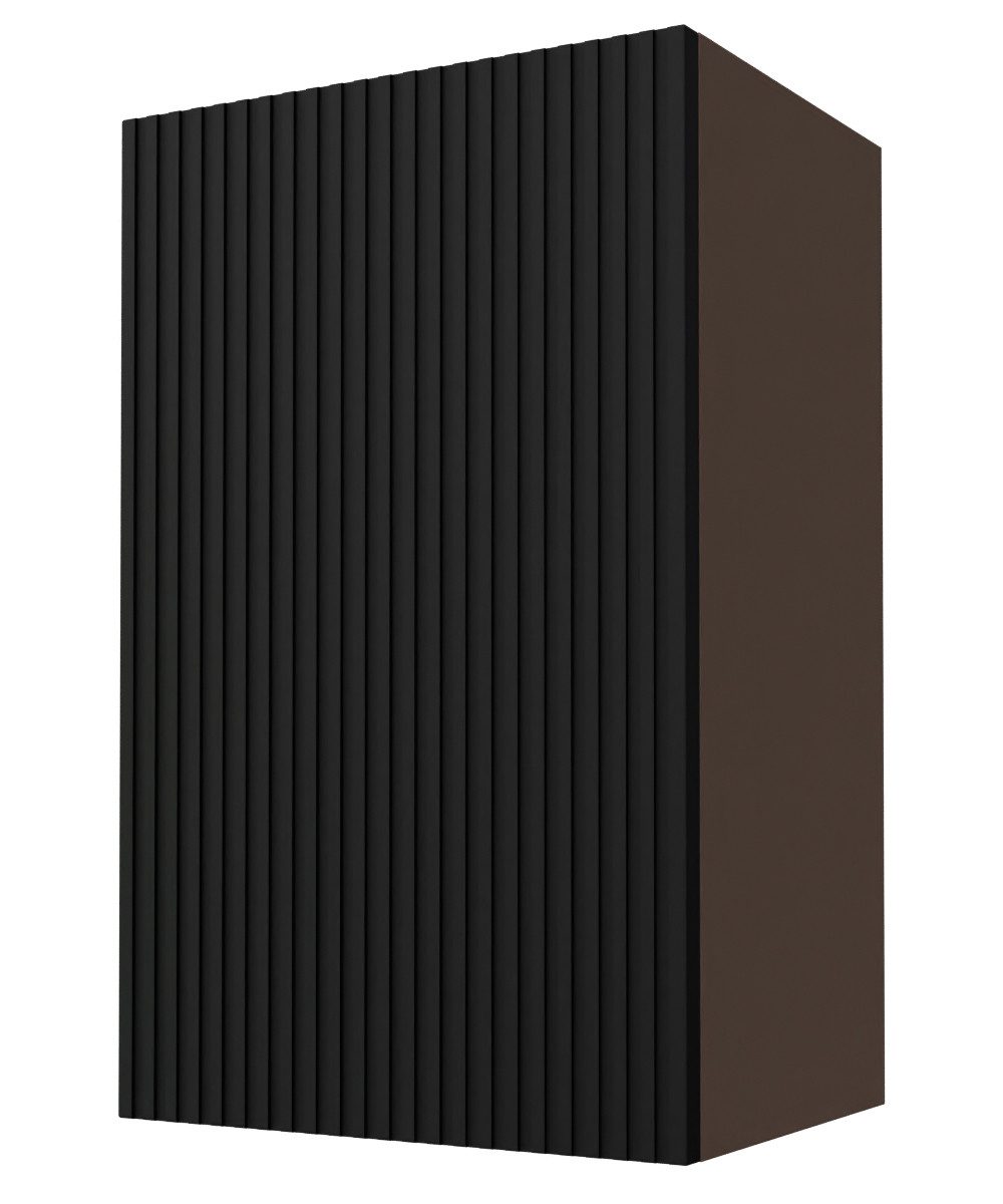 Das besondere Merkmal dieser hochwertigen Küchenschränke bilden die schwarz matt lackierten MDF-Fronten in Lamellen-Optik.