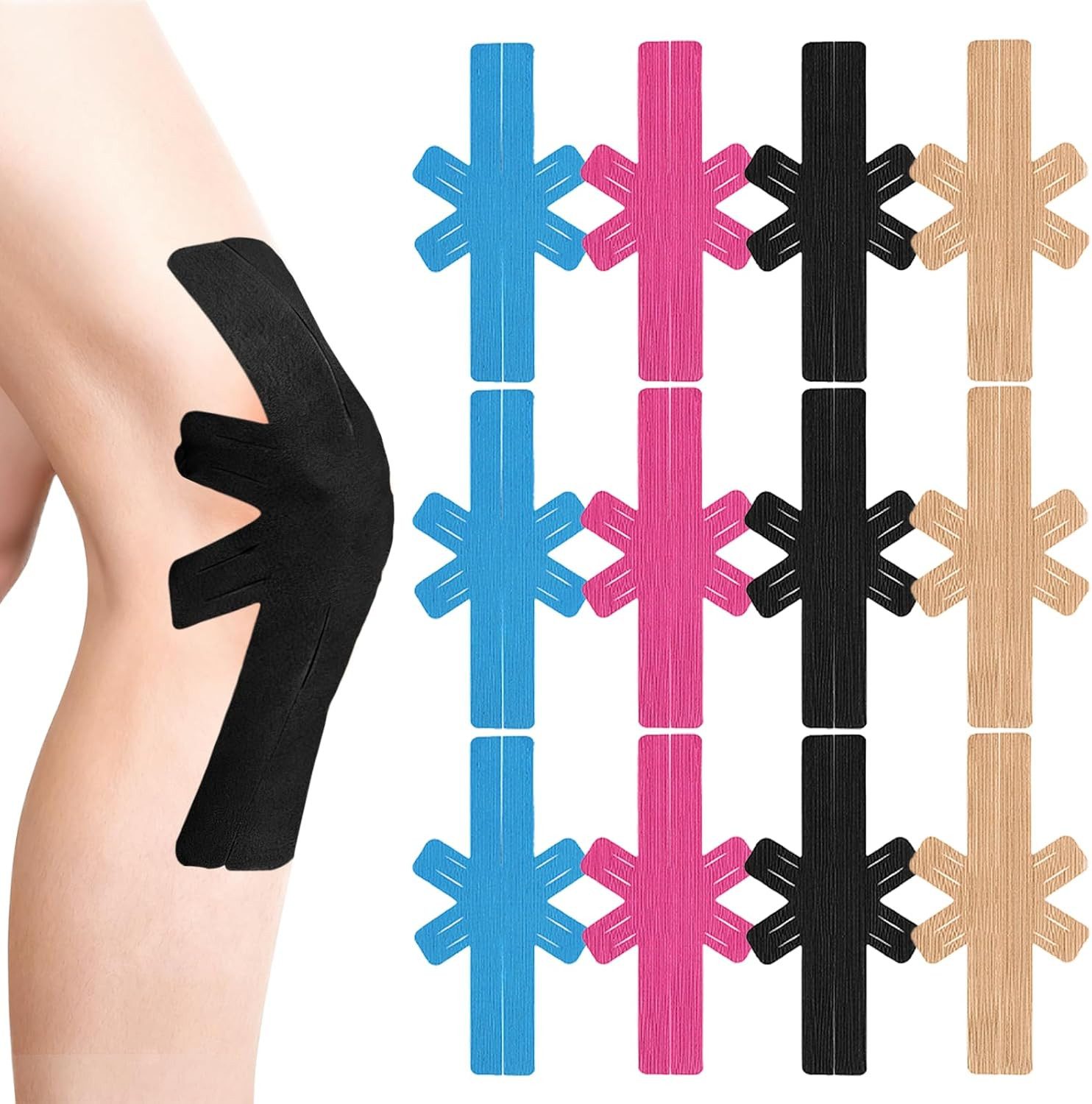 Knie-Muskelstützband-SetUnser Knieband-Set enthält 12 Stück (3 blaue, 3 beige, 3 schwarze und 3 rosa), die fest und dauerhaft auf der Haut haften, die Muskeln stützen und die Bewegungsfreiheit fördern. vorgeschnittener muskelpatch-knieschoner lindern wirksam Muskelschmerzen und sind äußerst praktisch für den täglichen Gebrauch.Hautfreundliches und atmungsaktives MaterialDiese knie tape vorgeschnitten bestehen aus hochwertiger Baumwolle und Elasthan und bieten im Vergleich zu herkömmlichen Muskelpflastern eine bessere Atmungsaktivität, Reißfestigkeit und Wasserdichtigkeit. Diese hochelastischen und atmungsaktiven knietape ziehen sich bei Bewegung während des Trainings zusammen und federn wieder zurück, wodurch sie das Knie stabil stützen und Muskelzittern reduzieren.Hervorragende Elastizität und DehnbarkeitUnsere knietapes vorgeschnitten knie verfügen über eine hervorragende Dehnbarkeit ihrer ursprünglichen Länge gedehnt werden. Sie lassen sich während des Gebrauchs leicht auf die gewünschte Länge dehnen, fördern die Durchblutung und lindern Schmerzen in Muskeln, Gelenken oder Bändern. Jede kinesiotapes knie verfügt über ein ultradünnes Design, um einen hohen Tragekomfort zu gewährleisten.Vorgeschnittenes DesignDiese tape knie (24.9 x 13 cm) ist vorgeschnitten und erfordert keine zusätzliche Vorbereitung für die Verwendung, was Zeit spart und Komfort und Bequemlichkeit gewährleistet. Einfach das nicht klebende Rasterpapier abziehen, das kinesio tapes auf die gewünschte Länge dehnen und entsprechend dem erforderlichen Stützgrad anbringen; vermeiden Sie es, die Klebefläche mit den Fingern zu berühren, da Fingerfett die Klebeeigenschaften beeinträchtigen kann.Breites AnwendungsspektrumUnsere Kniepflaster wurden speziell für hochintensive sportliche Aktivitäten entwickelt und bieten außergewöhnliche Unterstützung für Ihre Knie. Sie sind ideal für Sportler, ältere Menschen und alle, die zuverlässige elastische Physiotherapiepflaster suchen. Egal, ob Sie Fußball, Basketball, Schwimmen, Gewichtheben, Yoga, Golf oder Laufen betreiben, diese tape kinesiologie können dazu beitragen, das Verletzungsrisiko zu verringern.