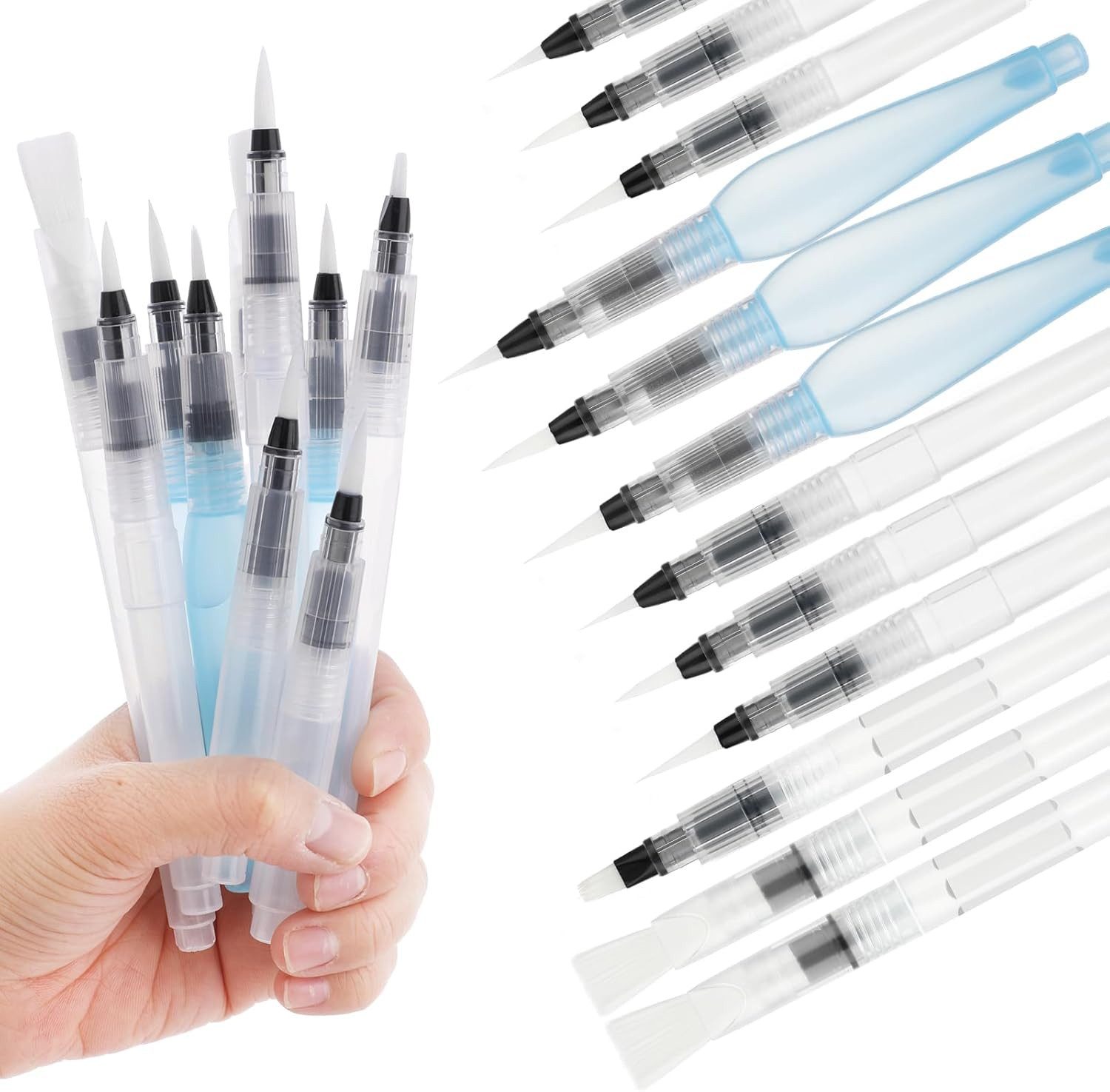 "Paketinhalt Sie erhalten 12 Stück Wasserstifte, 9 weiße und 3 blaue, einschließlich 3 Flachpinsel und 9 Spitzpinsel, um Ihren unterschiedlichen Malanforderungen gerecht zu werden.Hochwertige Materialien Hochwertige Pinselspitze aus Nylonborsten und ein Kunststoffkörper sorgen dafür, dass die Aquarellstifte intakt bleiben und bei der Verwendung nicht spritzen, sich ausbreiten oder verschmieren, was sie tragbar und langlebig macht.Einfach zu Verwenden Schrauben Sie einfach den Schaft des Aquarellstifts ab, um Wasser oder Tinte hinzuzufügen. Einfache Kontrolle der Tinte oder des Wasserflusses durch die Aquarellspitze. Leicht zu reinigen, wodurch Schmutz vermieden wird.Auslaufsicheres Design Dieser Aquarellpinsel ist auslaufsicher, leicht und wasserdicht, sodass er auf Reisen leicht zu transportieren und leicht zu reinigen ist.Breite Anwendung Diese Aquarellstifte eignen sich perfekt für Wasserfarben, Wasserfarben, Pulverfarben, unvergleichliche Wasserfarben, Pastelle, wasserlösliche Bleistifte, Acrylfarben, Gouache, Tinte und mehr."