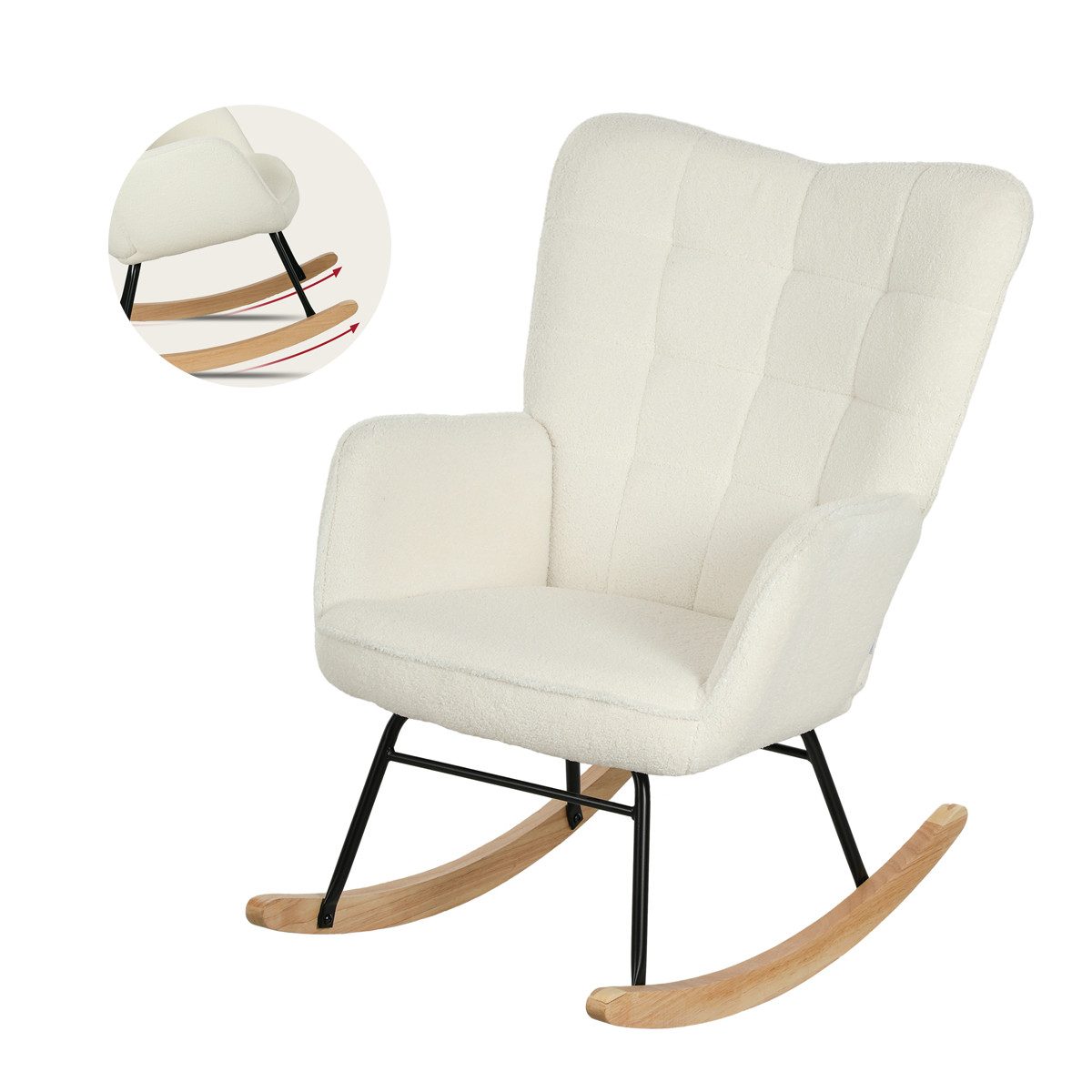 Bringen Sie Eleganz in Ihr Zuhause: Bringen Sie Ihren Stil auf die einfachste Art und Weise zur Geltung. Das Tufting an der Rückenlehne ist einzigartig, mit einer Berbervlies-Polsterung, die diesen Schaukelstuhl zu einem beeindruckenden Stück für Ihr Wohnzimmer, Schlafzimmer usw. macht.Entspannungszeit: Genießen Sie eine Zeit der Entspannung mit der Schaukelfunktion, indem Sie sanft hin und her schaukeln. Dieser Schaukelsessel ist perfekt für ein Nickerchen oder zum Entspannen nach einem langen Tag, aber auch für eine Mutter, die ihr Baby in den Schlaf wiegen möchte.Bequemer Sitz: Die sanft geneigte, hohe Rückenlehne mit Armlehnen auf beiden Seiten passt sich gut an die Konturen Ihres Körpers an, bequem für das Kinderzimmer, ein Nickerchen oder um sich mit einem Buch oder Tablet zusammenzurollen. Die dicke Polsterung des Stillsessels sorgt für ein entspannendes und komfortables Erlebnis. Außerdem ist die Oberfläche aus Berbervlies superweich und attraktiv.Sicher, sicher, sicher: Der Stahlrahmen und der Buchenholzsockel des Stillstuhls sorgen dafür, dass Sie einen guten Halt haben. Und die Holzbasis hat abgerundete Kanten und glatte Oberflächen, um Unfallverletzungen zu vermeiden.Produktdaten des Swingsessels: Gesamtmaße: 98T x 71B x 101H cm, Sitzgröße: 49T x 54B cm, Belastbarkeit: 120 kg, Montage erforderlich