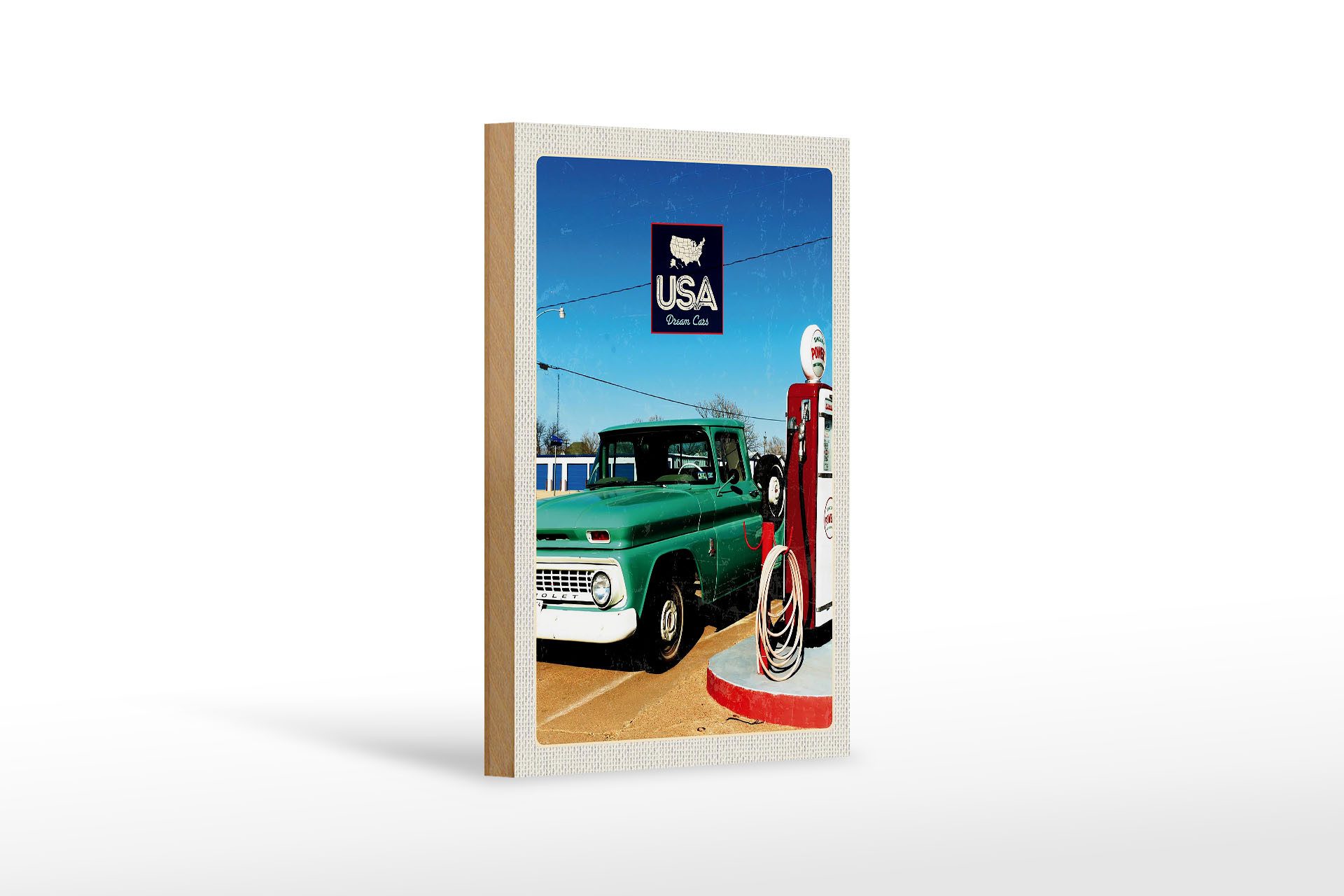 Femer GmbH Holzbild Reise 12x18 cm Amerika Oldtimer Tanksäule PKW, (1 St), Glatte Holzfaserplatte (MDF), vorn beschichtet