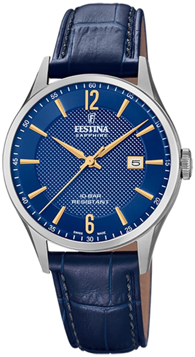 Die Elegant Uhr der Marke Festina hat ein schönes Armband aus Leder in blau mit Dornschließe. Eine Uhr aus der Festina Swiss Made Kollektion für Herren in der Gehäusefarbe silber mit Quarz. Die Analoguhr mit Saphirglas hat ein Zifferblatt in der Farbe blau. Die Form der Uhr ist rund und das Gehäuse ist groß ca. 40mm.