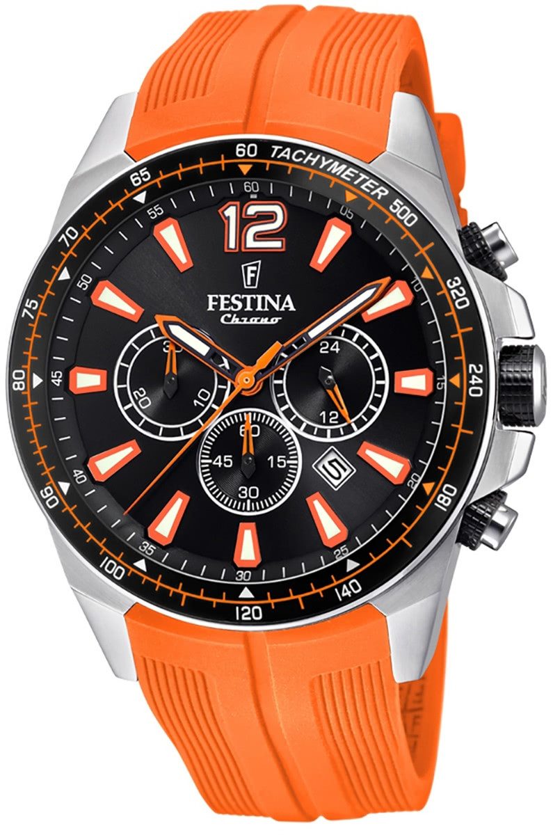 Die Sport Uhr der Marke Festina hat ein schönes Armband aus PU in orange mit Dornschließe. Eine Uhr aus der Festina The Originals Kollektion für Herren in der Gehäusefarbe silber mit Quarzwerk. Die Analoguhr mit Mineralglas hat ein Zifferblatt in der Farbe schwarz orange. Die Form der Uhr ist rund und das Gehäuse ist extra groß ca. 47mm.