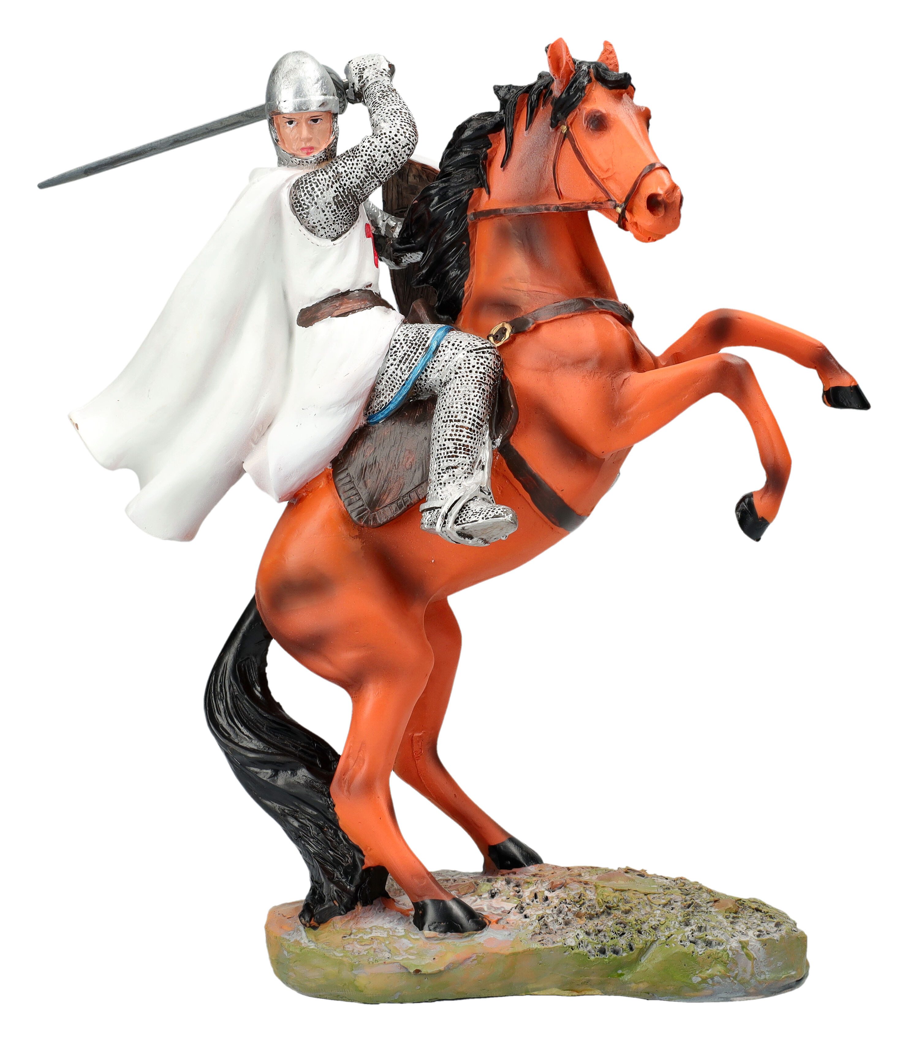 Diese eindrucksvolle Tempelritter Figur zeigt einen Ritter in voller Rüstung, hoch zu Ross, mit erhobenem Schwert. In seinem weißen Waffenrock mit rotem Kreuz symbolisiert er Mut und Entschlossenheit. Die Szene auf dem aufbäumenden Pferd ist kraftvoll und lebendig – ein idealer Blickfang für jede Sammlung oder als mittelalterliche Deko.
