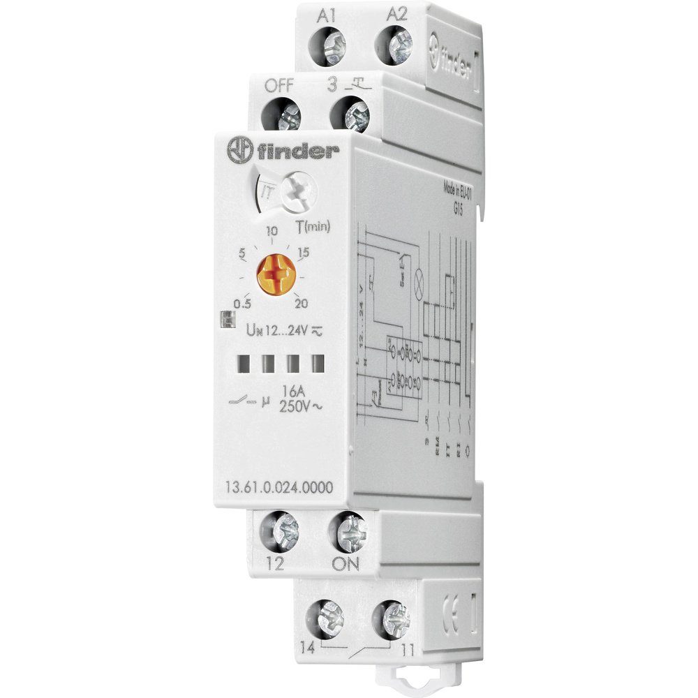 Elektronischer Stromstoßschalter, 4 Funktionen: Monostabiles Relais, Abschaltverzögerung-einstellbarer Zeitbereich 0,5 bis 20 Minuten mit vorzeitiger Ausschaltmöglichkeit, über zusätzliche Set- und Reset-Taster ist ein zentrales EIN- und AUS-Schalten realisierbar, Stromstoßrelais/Schalter und Dauerlicht. 1 Schließer für 16 A, Kontaktmaterial AgSnO2, max.-Einschaltstrom 120 A-5 ms, Lampenlasten: Glüh- und Halogenlampen 2000 W, Energiesparlampen 400 W, LED (230 V AC) 400 W, NV-Halogenlampen oder LED mit EVG 400 W, NV-Halogenlampen oder LED mit KVG 1500 W, Leuchtstofflampen mit EVG 800 W, Leuchtstofflampen mit KVG 1000 W, Umgebungstemperatur -10 bis + 60 °C., Anschlussspannung 12-24 V AC/DC.