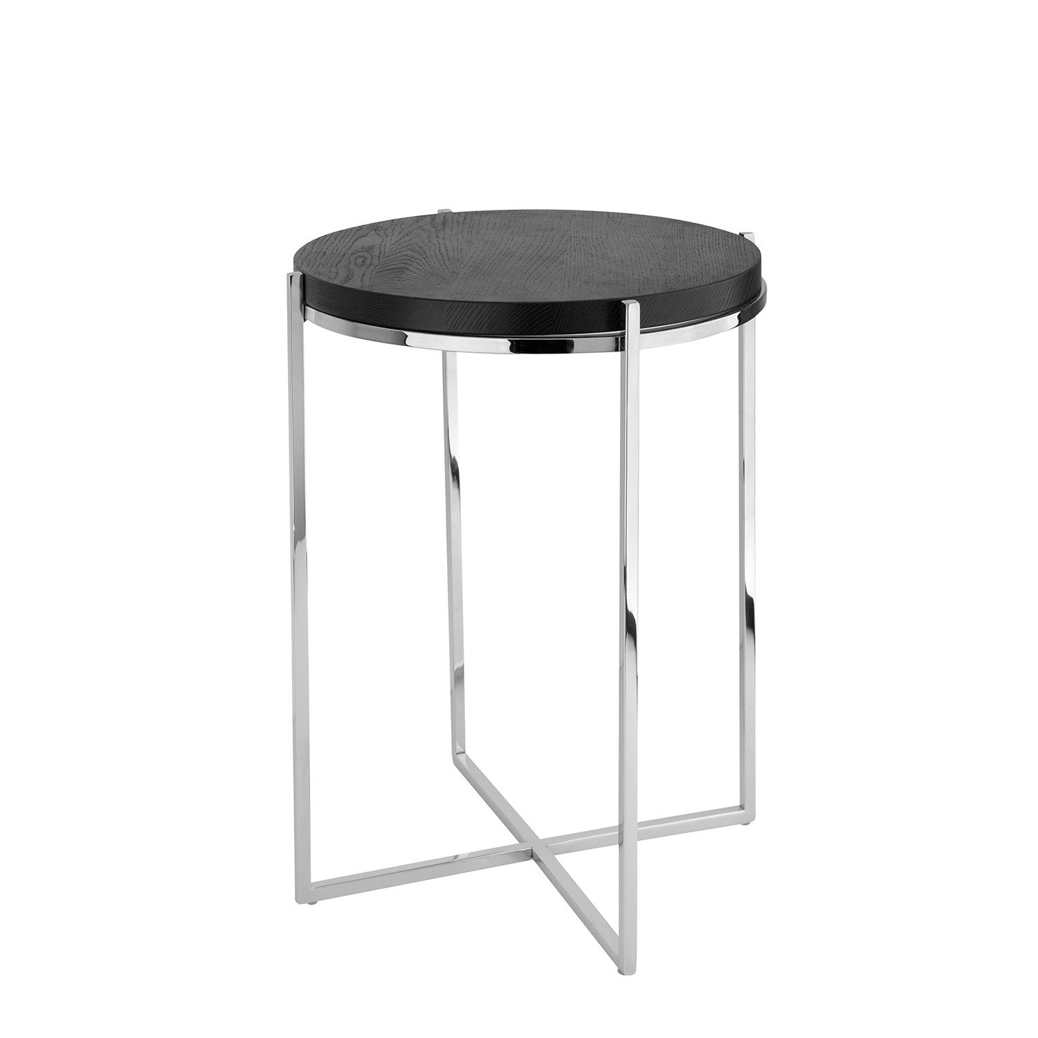 Der FINK Beistelltisch BRIXTON aus Edelstahl und Eiche ist ideal für Wohnzimmer und Nachttisch, mit einer glatten Oberfläche in braun, schwarz und silberfarben.