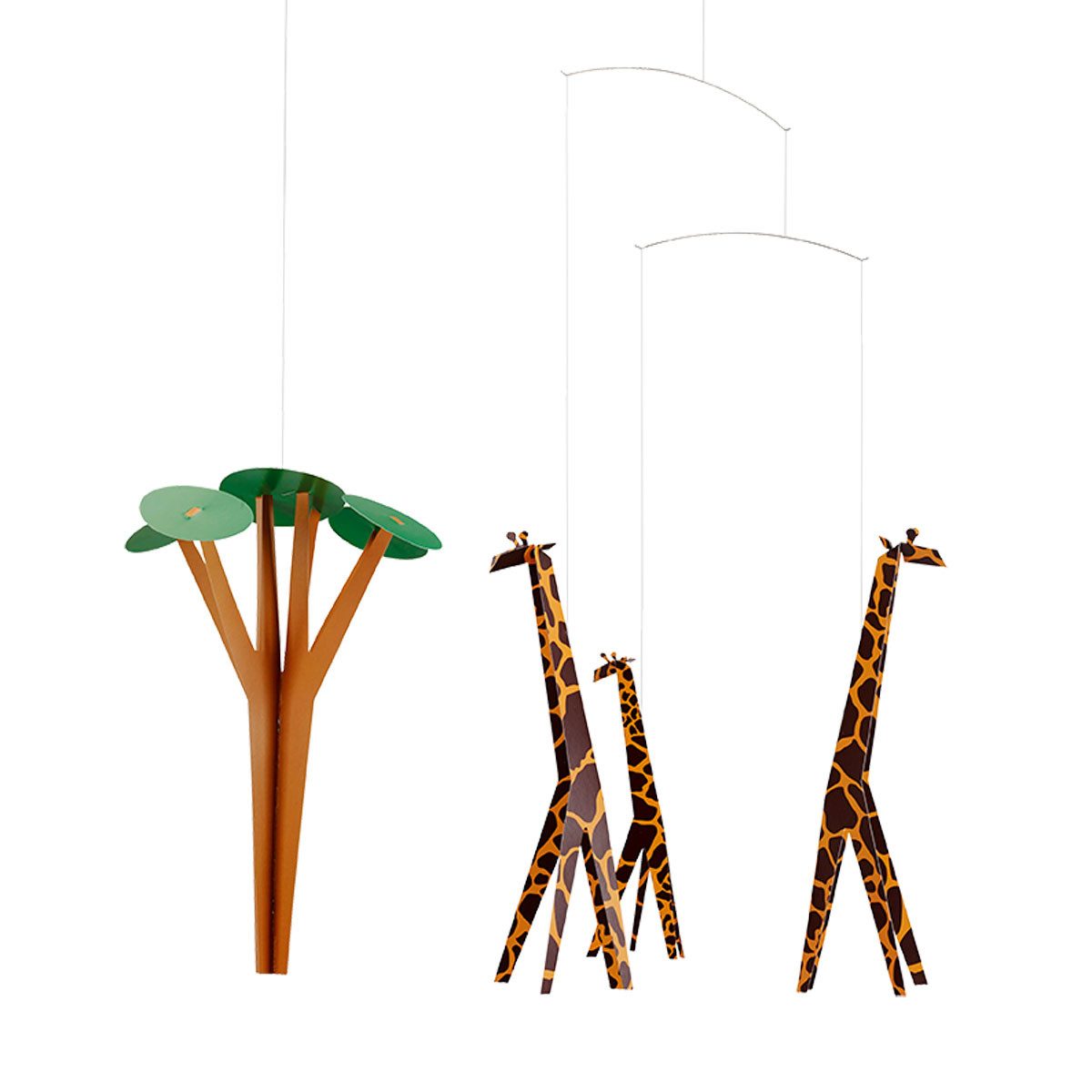 Flensted - Giraffen in der Savanne Die Giraffe ein beeindruckendes Tier. Das sich in dem Mobile in einer kleinen Horde von drei Tieren zusammentut und um einen Akazienbaum läuft.  Die Bewegungen des Mobiles erwecken den Eindruck das sich die Giraffen um den Baum bewegen und mit ihm interagieren würden.