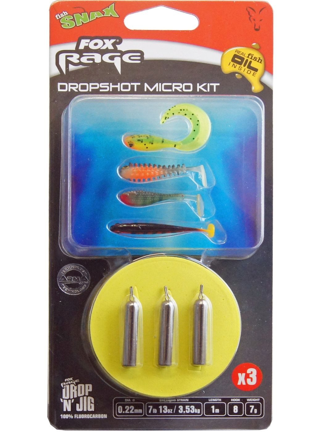 Fox Rage Dropshot Micro Kit - 3 Drop Shot Rig - Das Kunstköder Set von Fox Rage beinhaltet 4 Softbaits, 3 Dropshot Bleie sowie 3 Dropshot Vorfächer und es dient zum Dropshotangeln auf Barsche und Forellen. Die Dropshot Montagen sind mit einem Dropshothaken der Größe 8 gebunden und sie sind somit für den sofortigen Einsatz beim aktiven Barschangeln und Forellenangeln. Es muss lediglich einer der vier Gummiköder auf den Raubfischhaken gezogen und ein Dropshot Blei eigehängt werden, ehe das aktive Angeln auf Raubfische beginnen kann. Die Bleigewichte von 7g ermöglichen das Dropshotten vom Ufer sowie vom Boot in Seen, Kanälen und langsam fließenden Flüssen. Die Fluorocarbon Vorfachschnur ist für die Raubfische nahezu unsichtbar unter Wasser, wodurch auch vorsichtige Barsche und Forellen überlistet werden können.