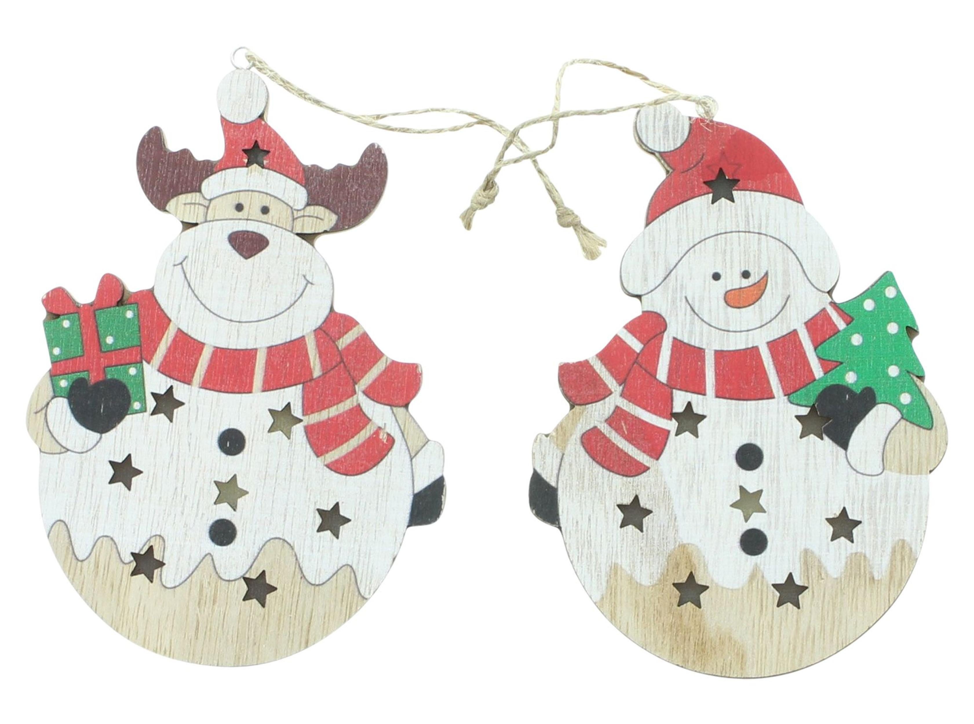 LED-Hänger "Schneemann & Elch", 2er Set: Winterliche Freunde im Doppelpack! Unser 2er Set LED-Hänger "Schneemann & Elch" aus Holz und Jute, jeweils mit 5 warmweißen LEDs (Höhe 14 cm), verbreitet eine fröhliche Stimmung. Ohne Batterien geliefert und nur für den Innenbereich geeignet, sind diese batteriebetriebenen Hänger ein süßes Detail für die Weihnachtszeit.