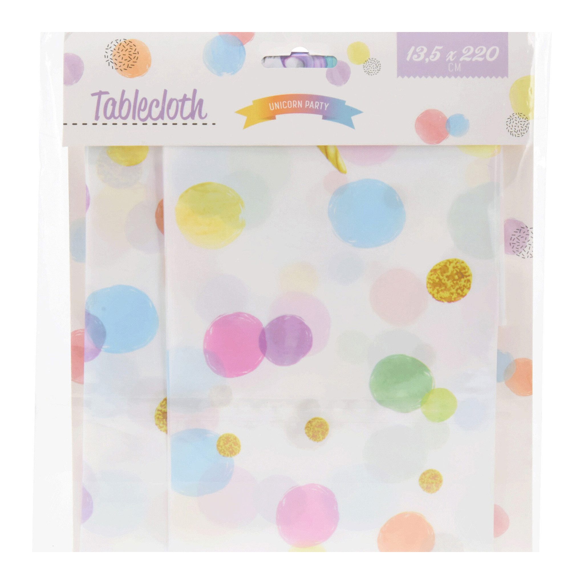 MÄRCHENHAFTE ATMOSPHÄRE: Die Partytischdecke mit bunten Punkten und Einhörnern schafft eine bezaubernde Atmosphäre auf jeder Kinder - Feier
