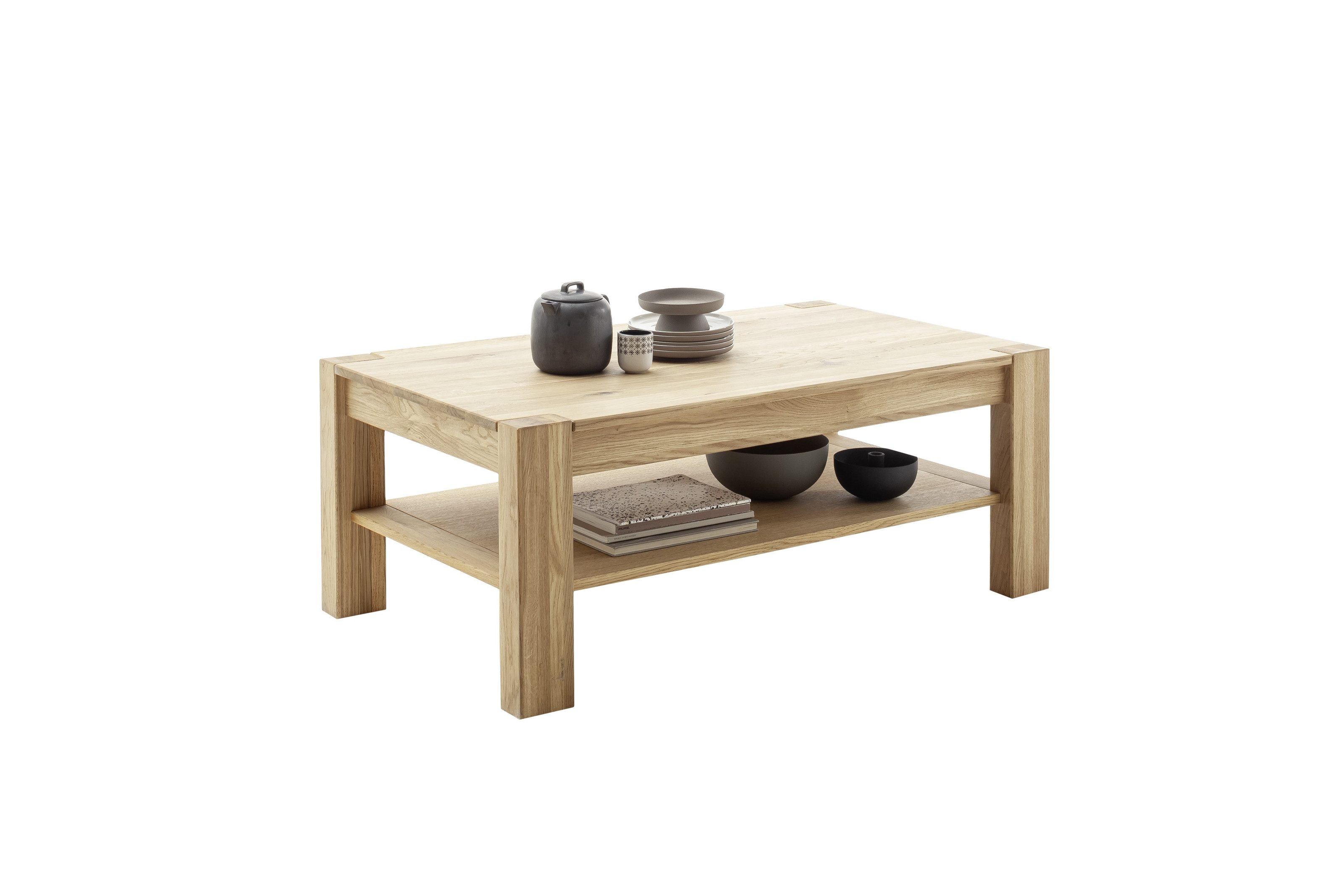 Dieser elegante Couchtisch aus massiver Wildeiche und Dekor überzeugt durch seine hochwertige Verarbeitung und das zeitlose Design. Mit einer Breite von ca. 115 cm, einer Höhe von 46 cm und einer Tiefe von 65 cm bietet der Tisch eine großzügige Fläche für Getränke, Snacks und Dekoration. Die Tischplatte ist 20 mm dick und besteht aus massiver Wildeiche mit durchgehenden, geölten Lamellen, die der Oberfläche eine warme Ausstrahlung verleihen und die natürliche Maserung des Holzes betonen. Die robusten Tischbeine sind ebenfalls aus massiver Wildeiche gefertigt und bieten eine stabile Grundlage. Die Ablagefläche unterhalb der Tischplatte sorgt für zusätzlichen Stauraum und ist ideal für Zeitschriften, Fernbedienungen oder andere kleinere Gegenstände, die griffbereit aufbewahrt werden sollen. Der Couchtisch wird in zerlegter Form geliefert und lässt sich dank der einfachen Aufbauanleitung problemlos montieren. Als FSC-zertifiziertes Produkt (FSC Mix) entspricht er hohen Umweltstandards und trägt zur Nachhaltigkeit bei. Mit seiner klaren Linienführung und der natürlichen Holzoptik fügt sich der Couchtisch perfekt in moderne sowie traditionelle Wohnräume ein und wird zu einem stilvollen Mittelpunkt in Ihrem Wohnzimmer.