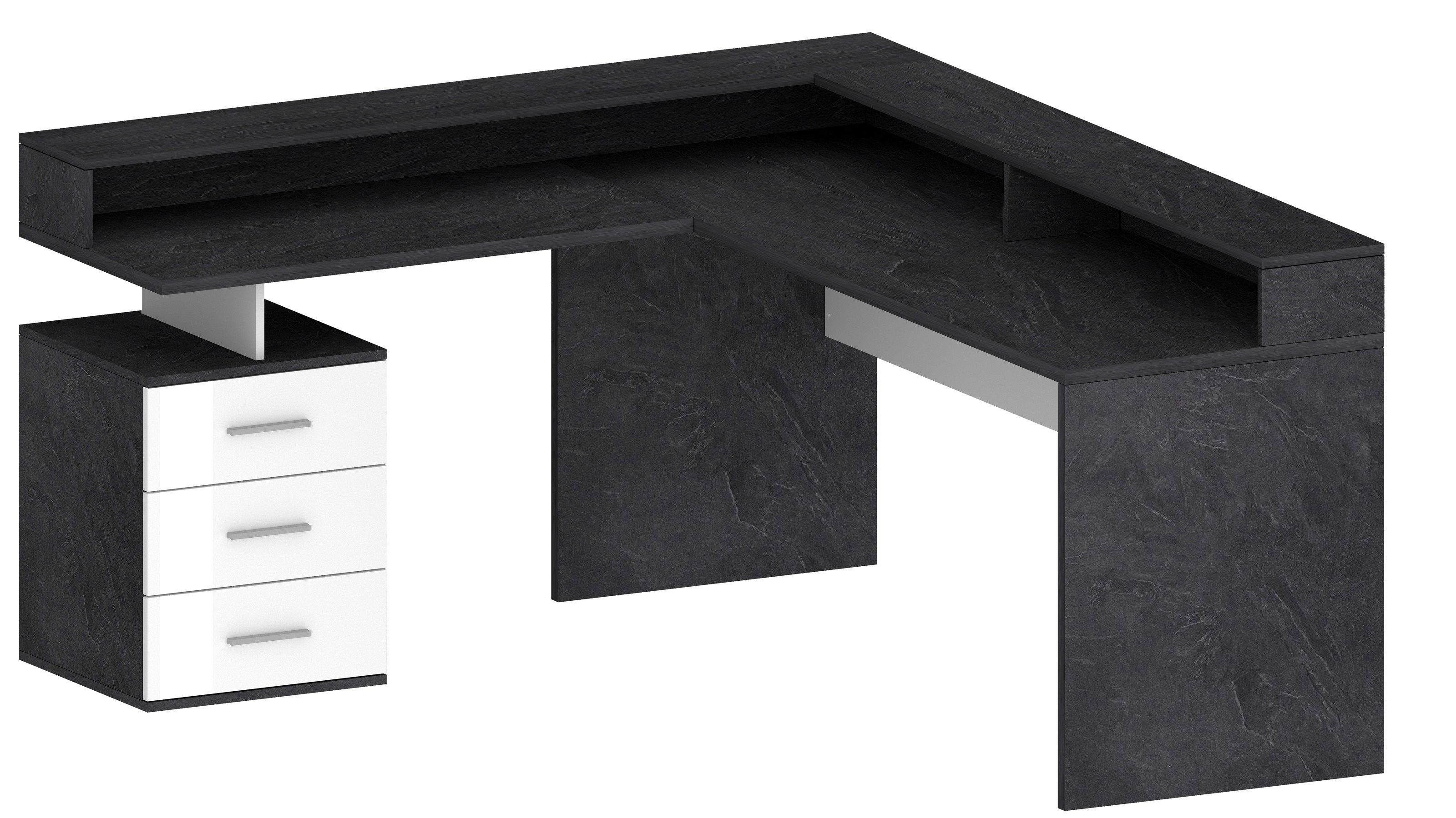 Der Eckschreibtisch Novara verbindet modernes Design mit praktischer Funktionalität. Mit einer Höhe von 90 cm, einer Breite von 160 cm auf der einen und 180 cm auf der anderen Seite, sowie einer Tiefe von 60 cm, bietet dieser Schreibtisch eine ausgedehnte Arbeitsfläche, die sich perfekt für eine effiziente und komfortable Büroeinrichtung eignet. Die großzügigen Abmessungen ermöglichen es, sowohl einen Computerarbeitsplatz als auch zusätzliche Büroaccessoires oder Dokumente unterzubringen. Die Kombination aus Schiefer und Weiß Hochglanz verleiht dem Schreibtisch eine zeitlose Eleganz, die sich mühelos in moderne Einrichtungsstile integrieren lässt. Gefertigt aus melaminharzbeschichteter Spanplatte, zeichnet sich der Novara Schreibtisch durch seine Langlebigkeit und Widerstandsfähigkeit aus. Das Material ist nicht nur robust, sondern auch pflegeleicht und bietet eine stilvolle Oberfläche, die den täglichen Anforderungen des Arbeitsalltags standhält. Die Tischplatte hat eine Stärke von 2,5 cm, was für zusätzliche Stabilität und eine hochwertige Anmutung sorgt. Die hochwertige Verarbeitung und die Verwendung von FSC®-zertifizierten Materialien unterstreichen den umweltfreundlichen Aspekt dieses Möbels, welches in Italien hergestellt wird. Der Novara Schreibtisch ist mit drei praktischen Schubladen ausgestattet, die auf stabilen Metallschienen laufen. Diese bieten ausreichenden Stauraum für wichtige Unterlagen, Schreibmaterialien und persönliche Gegenstände. Die Schubladen lassen sich dank der Metallschienen leichtgängig öffnen und schließen, was den Zugang zu Ihren Utensilien komfortabel und unkompliziert gestaltet. Diese Funktionalität trägt dazu bei, den Arbeitsplatz organisiert und übersichtlich zu halten. Der Schreibtisch wird zerlegt geliefert, aber die Montage ist dank der detaillierten Anleitung, die im Lieferumfang enthalten ist, einfach und schnell erledigt. Optional ist der Novara Schreibtisch auch mit Beleuchtung erhältlich, die für eine optimale