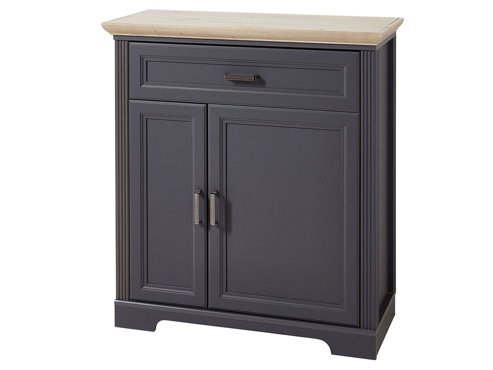 Der Schuhschrank "Jasmin II" ist hier in elegantem Graphit gehalten, welches stilsicher mit Absetzungen in vornehmer Artisan Eiche Nachbildung kombiniert wird. Insbesondere in Verbindung mit den antiken Metallgriffen, sowie den Ausfräsungen der Front wird dem Schuhschrank eine ländlich angehauchte, heimelige Erscheinung verliehen. Die Holznachbildung ist qualitativ sehr hochwertig mit täuschend echter Maserung.