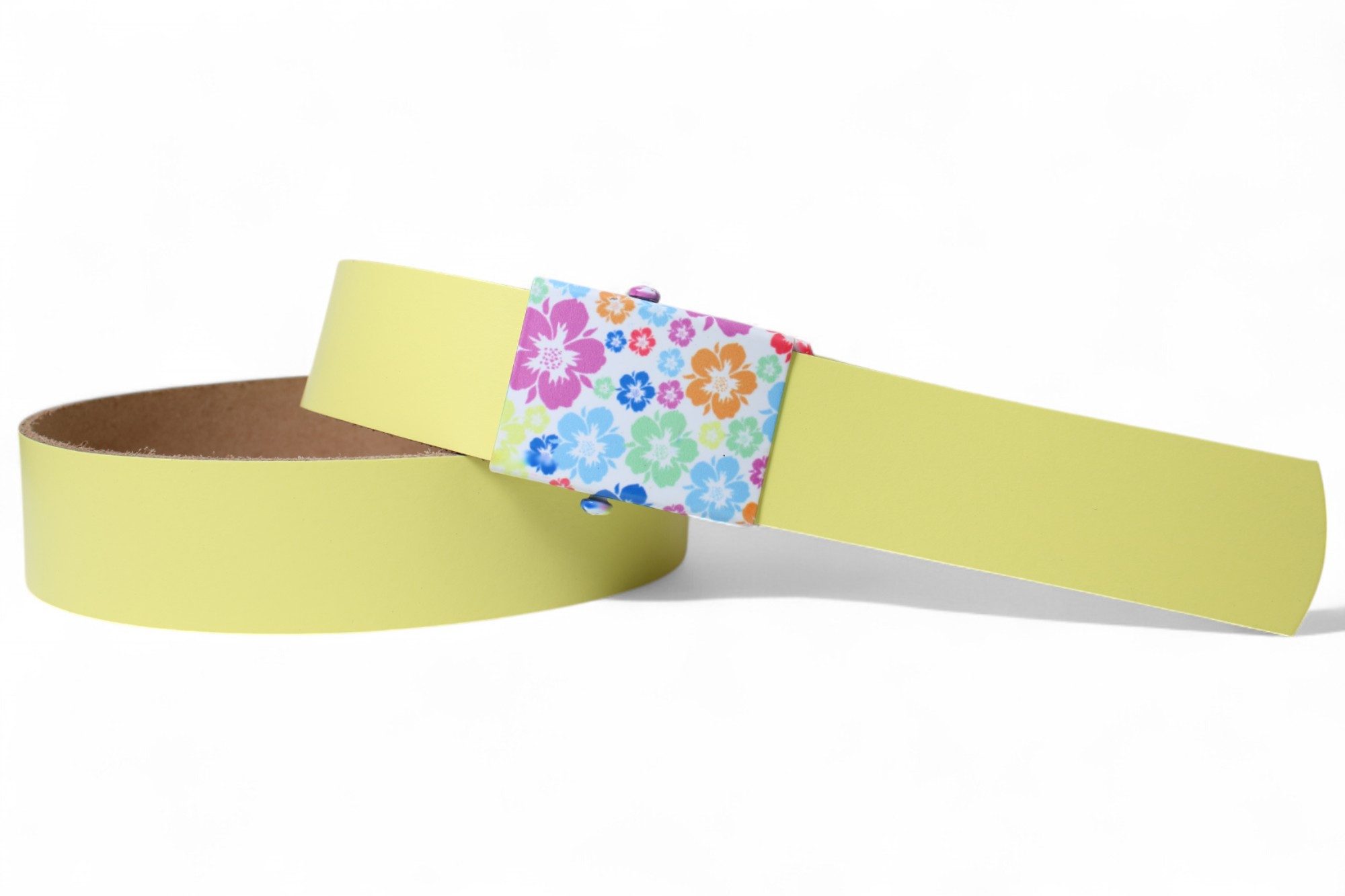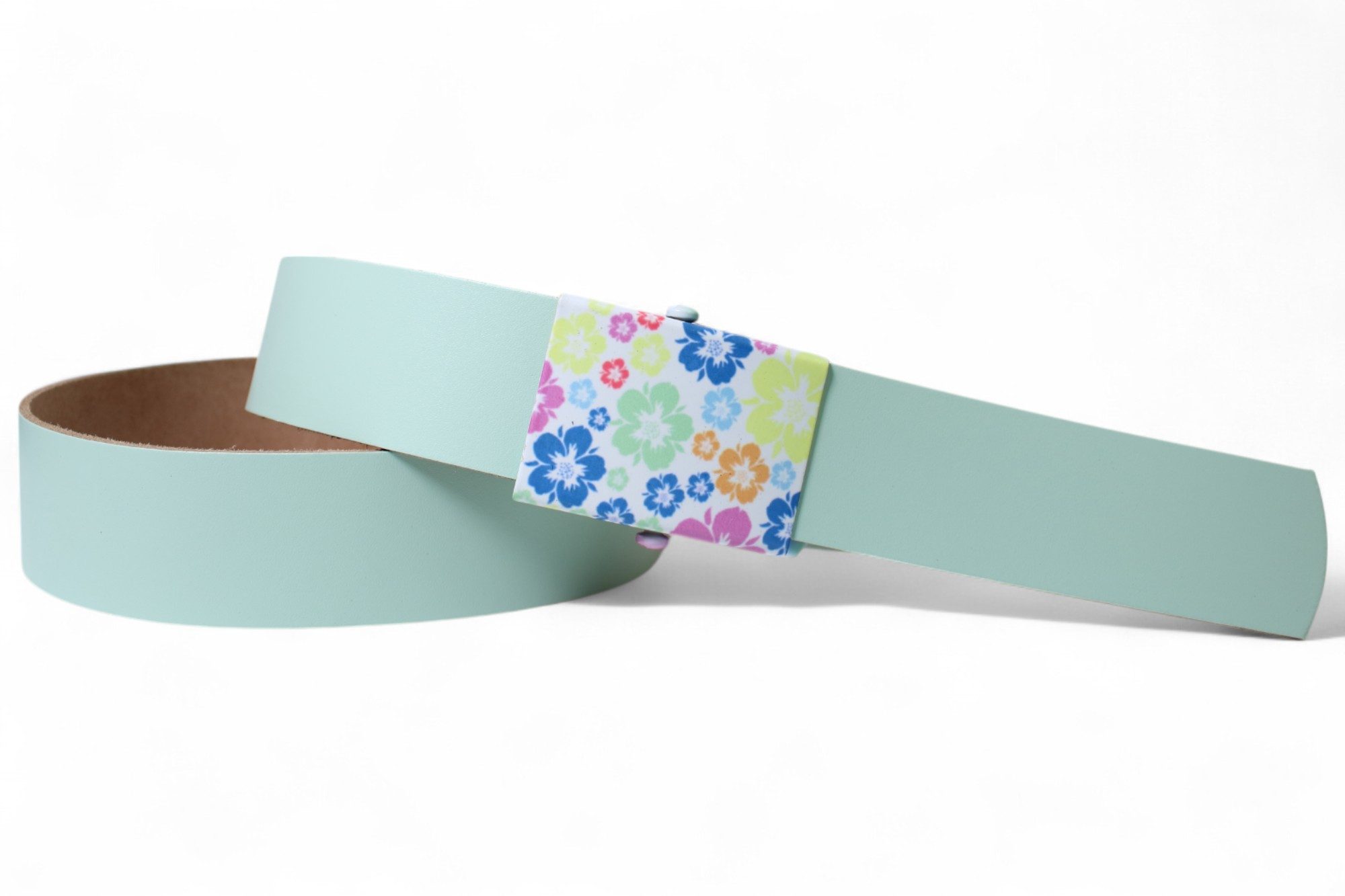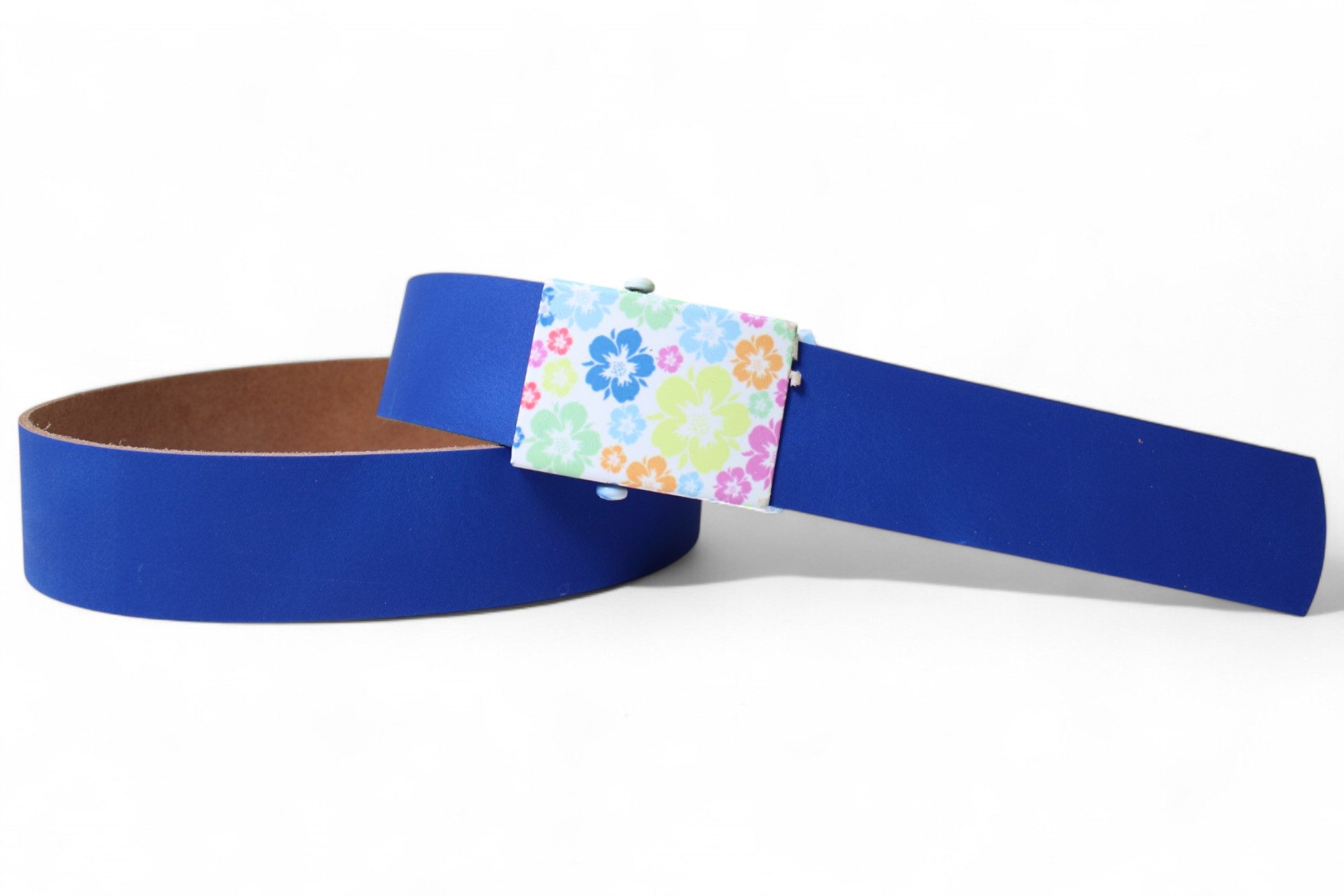 Ideal als Jeansgürtel oder Alltagsgürtel – farbenfrohe Schnalle trifft auf schlichtes Leder. Riemenbreite liegt bei etwa 40 mm. Made in Germany.