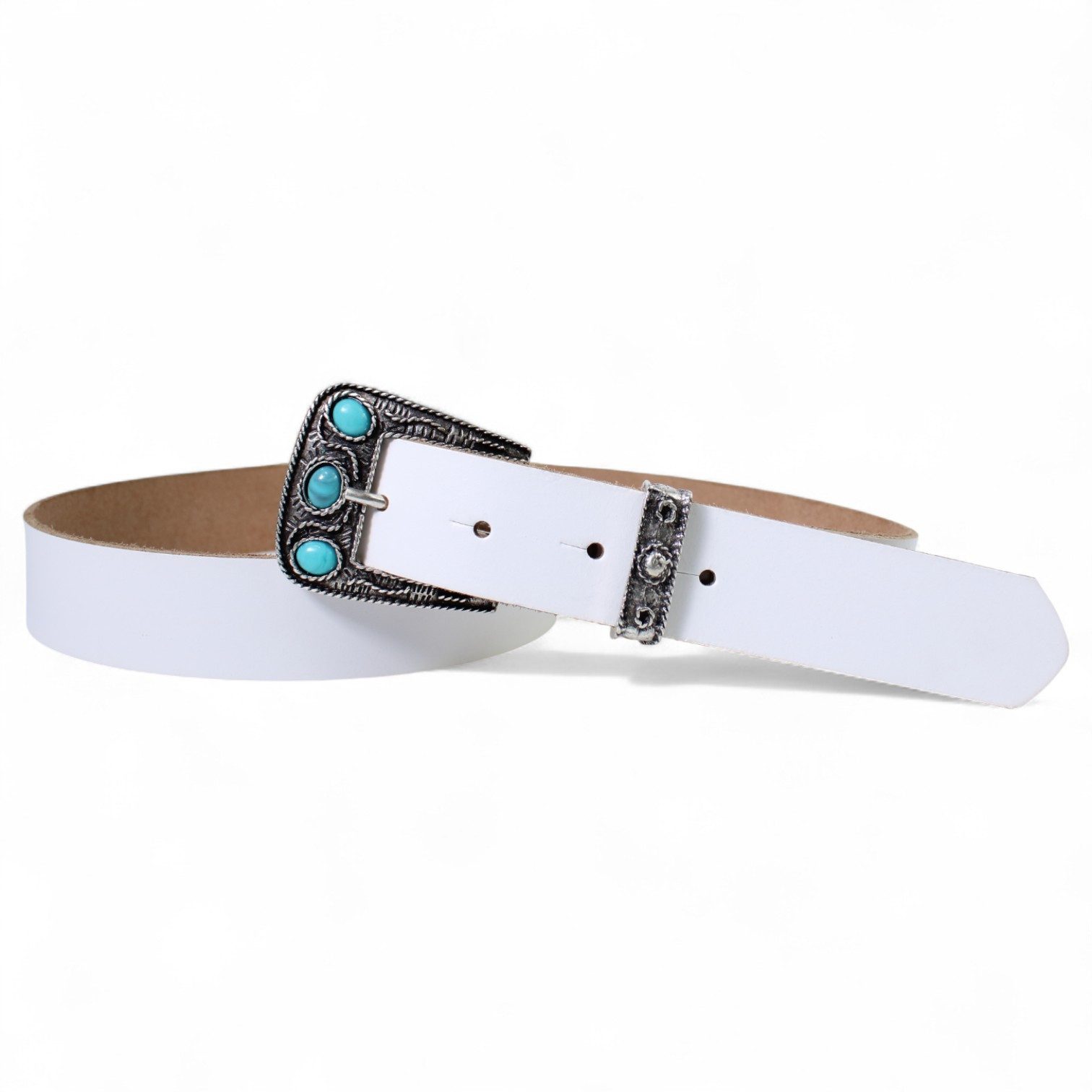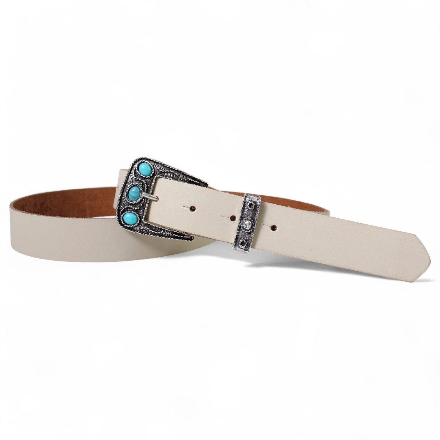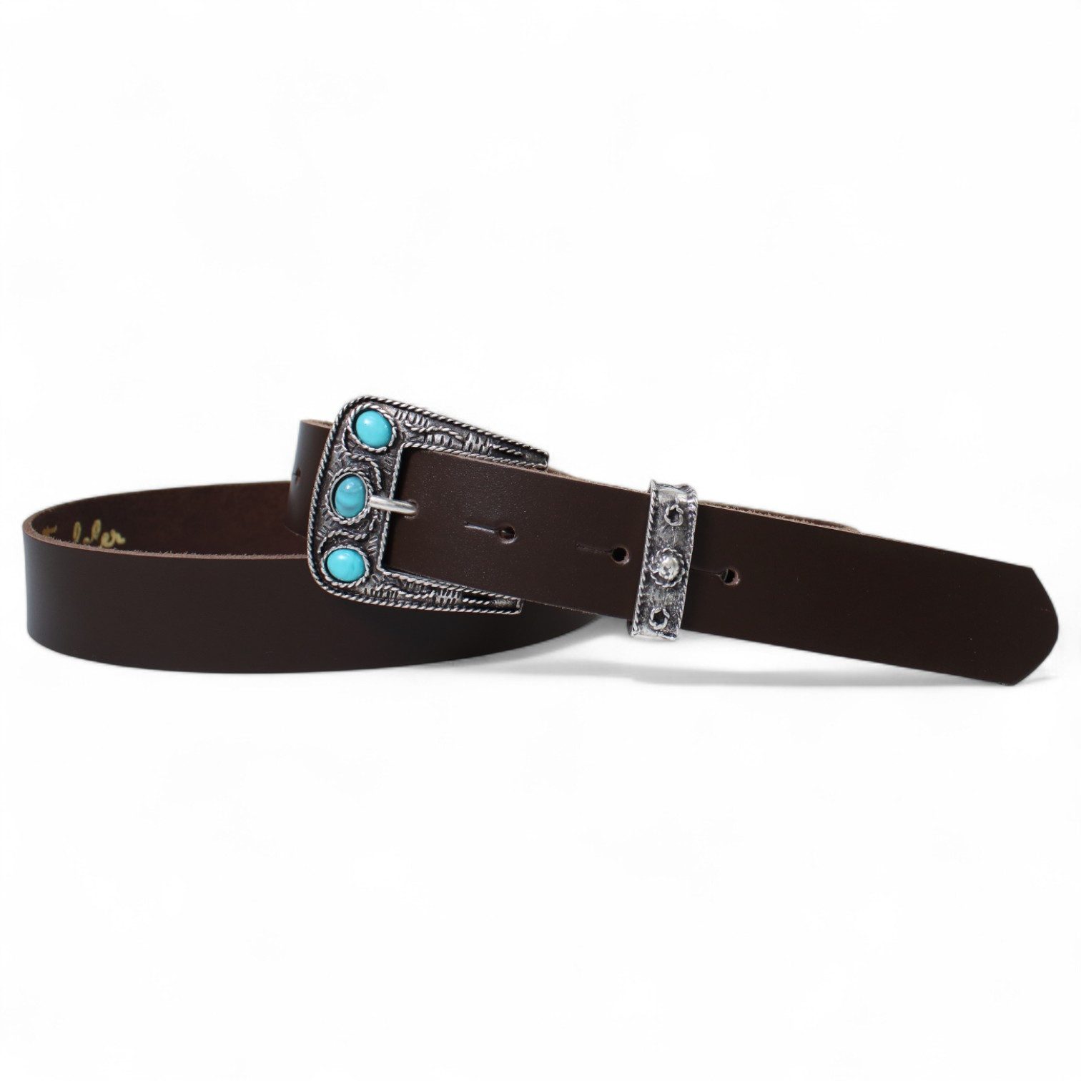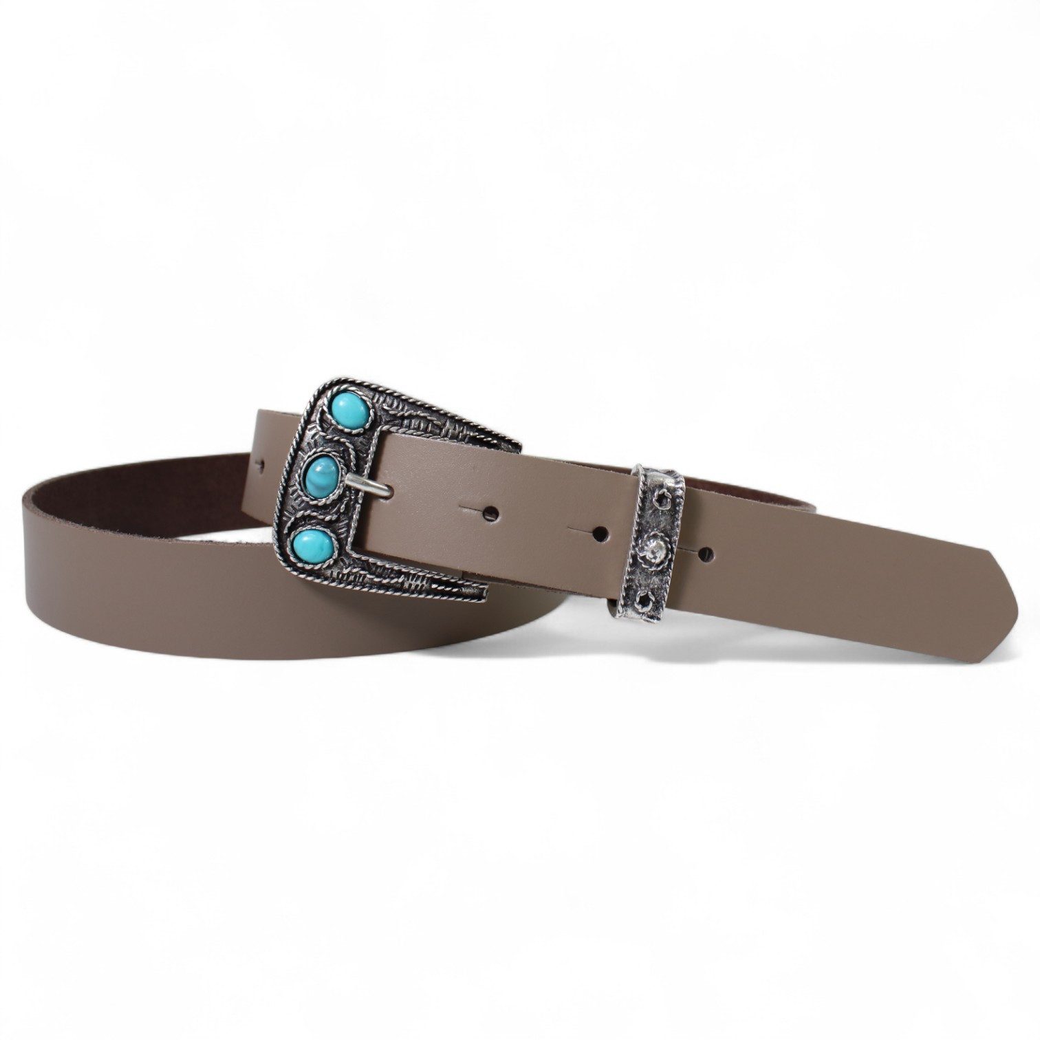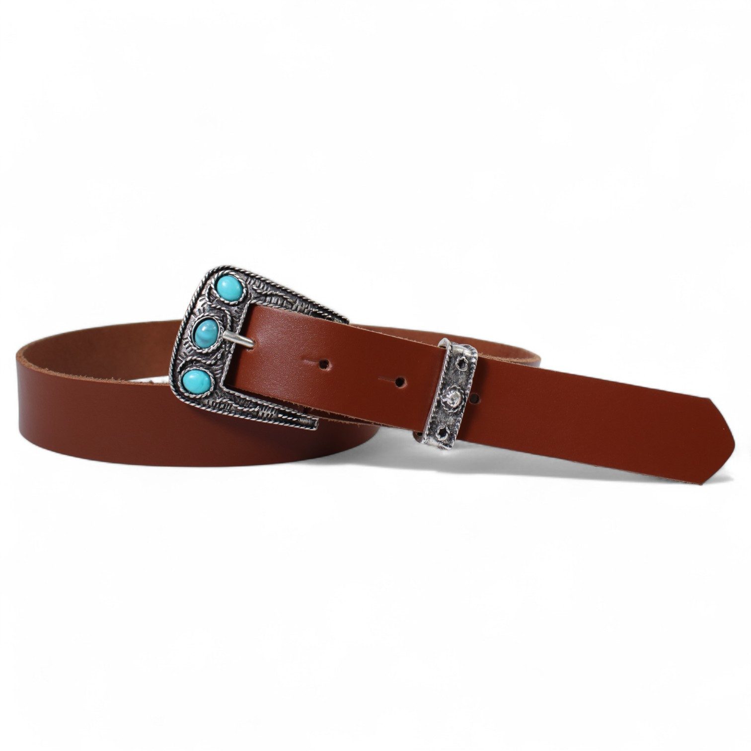 Der Gürtel kommt mit einer dekorativen Metall-Schmuckschnalle mit türkisen Steinen, die Schnalle misst ca. 5,5 × 4,5 cm. Die Riemenbreite liegt bei etwa 30 mm (mit ca. 3 cm Breite), dadurch wirkt das Accessoire klar und stilbildend ohne aufzutragen.