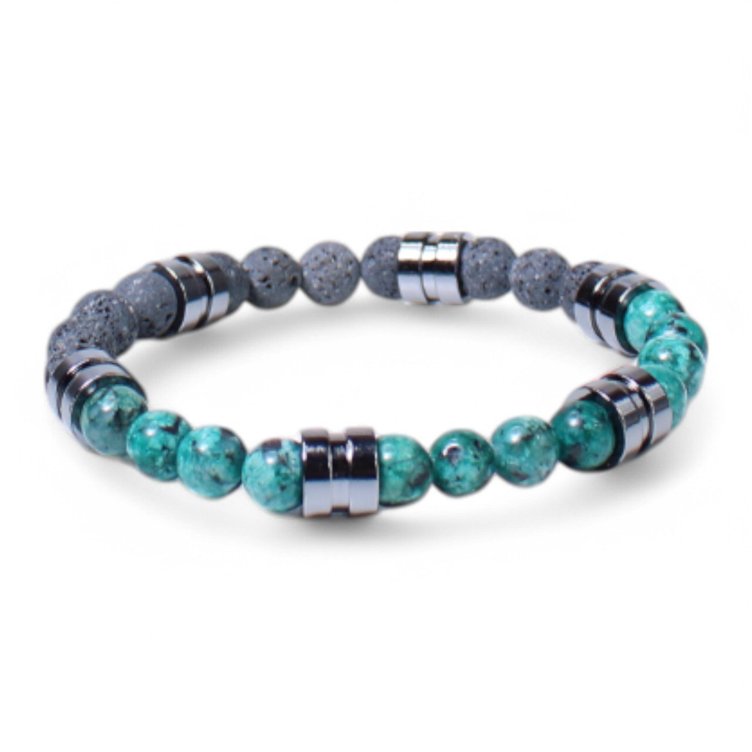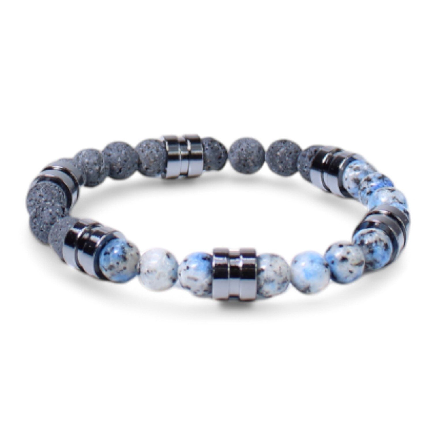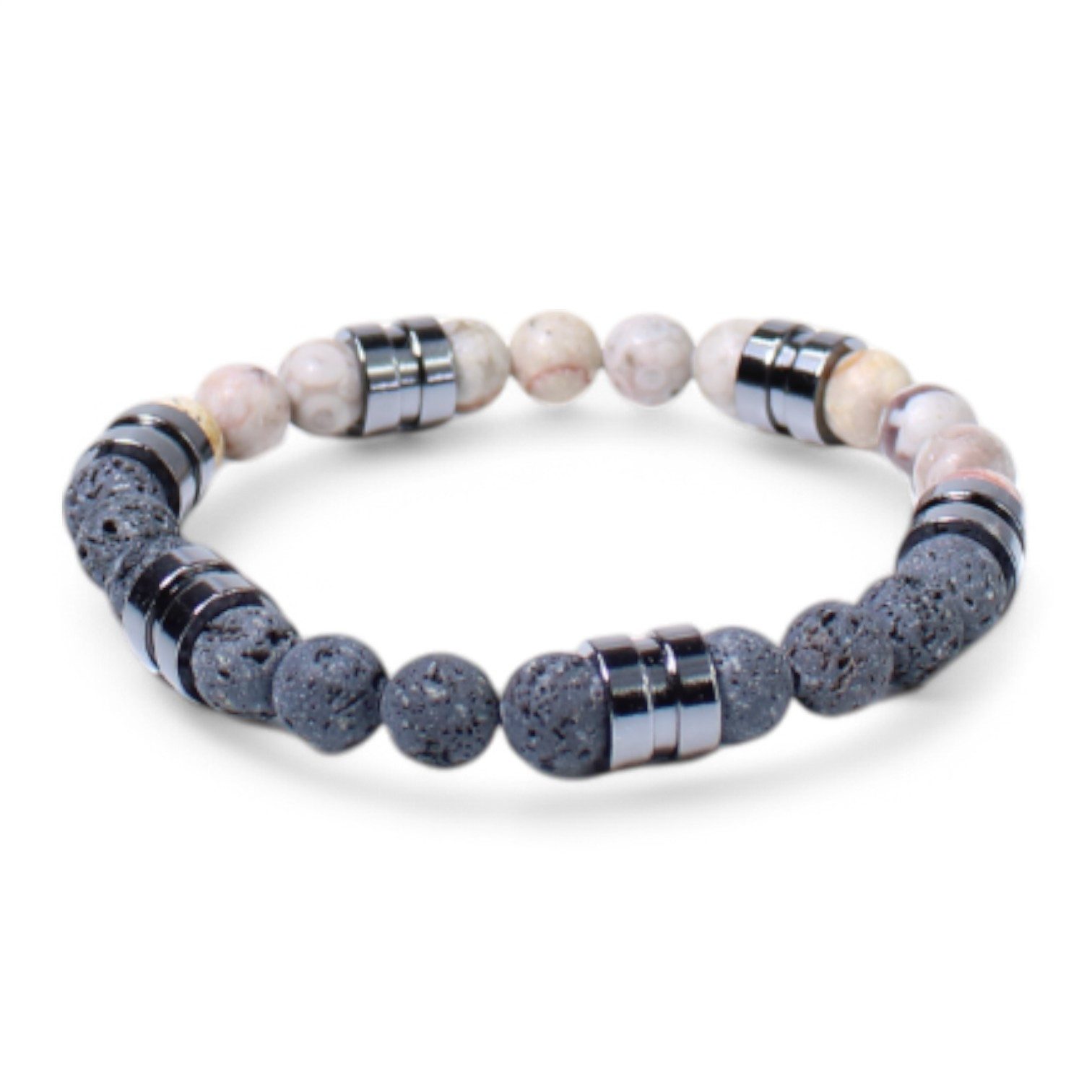 Maskulines Herrenarmband mit unterschiedlichen Arten von Perlen. Zum einen werden graue Lavasteinperlen abwechselnd mit einem passenden Metallteil verwendet. Die andere Seite wird mit farblich passenden Natursteinperlen veredelt. Zusammen ergibt es einen stimmigen Look.