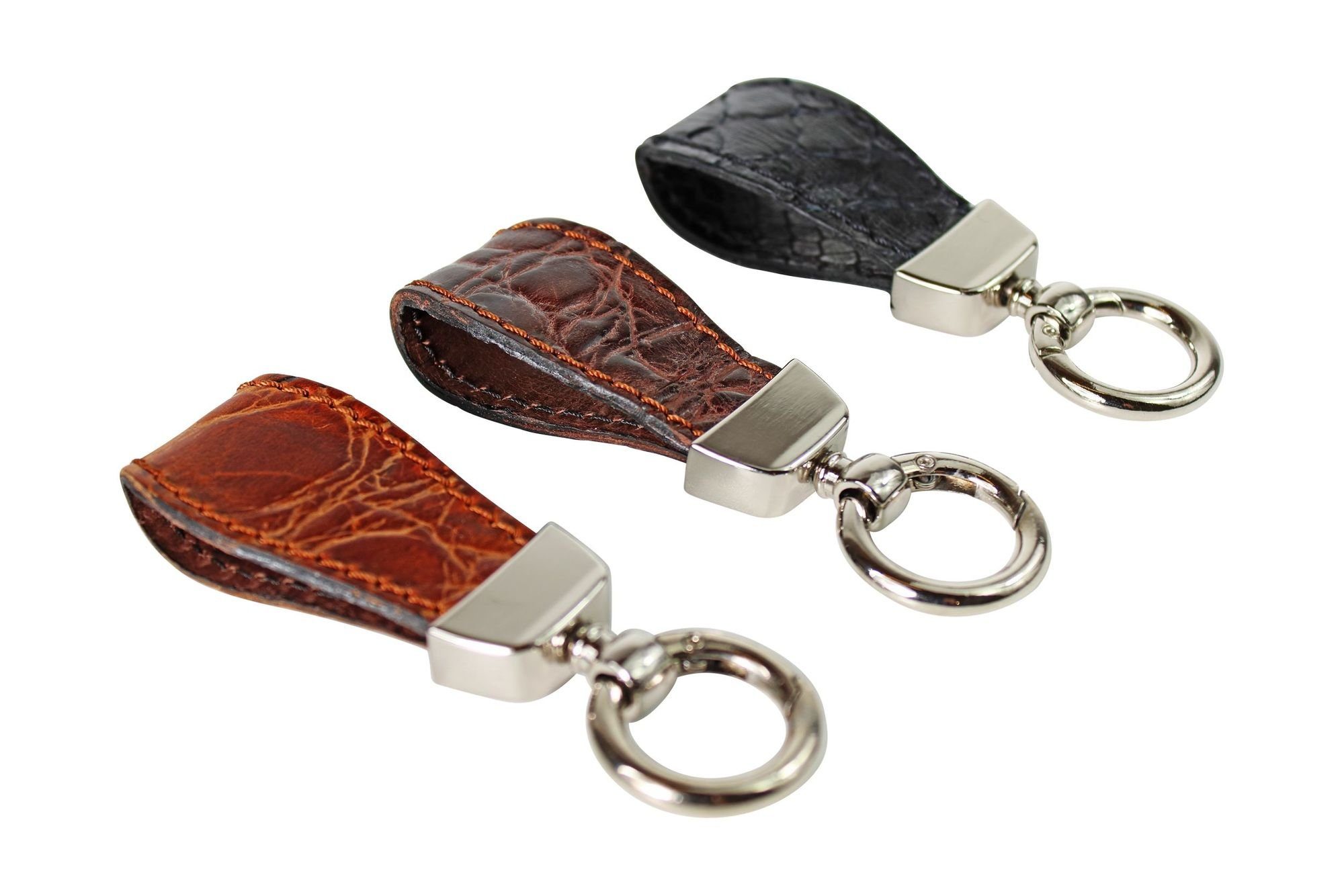 Edler Schlüsselanhänger aus Kalbsleder mit Krokoprägung, mit farblich passender Steppnaht. In 3 klassischen Farben erhältlich. Die ca. 15mm breite Endkappe mit Klappring ist aus Stahl.