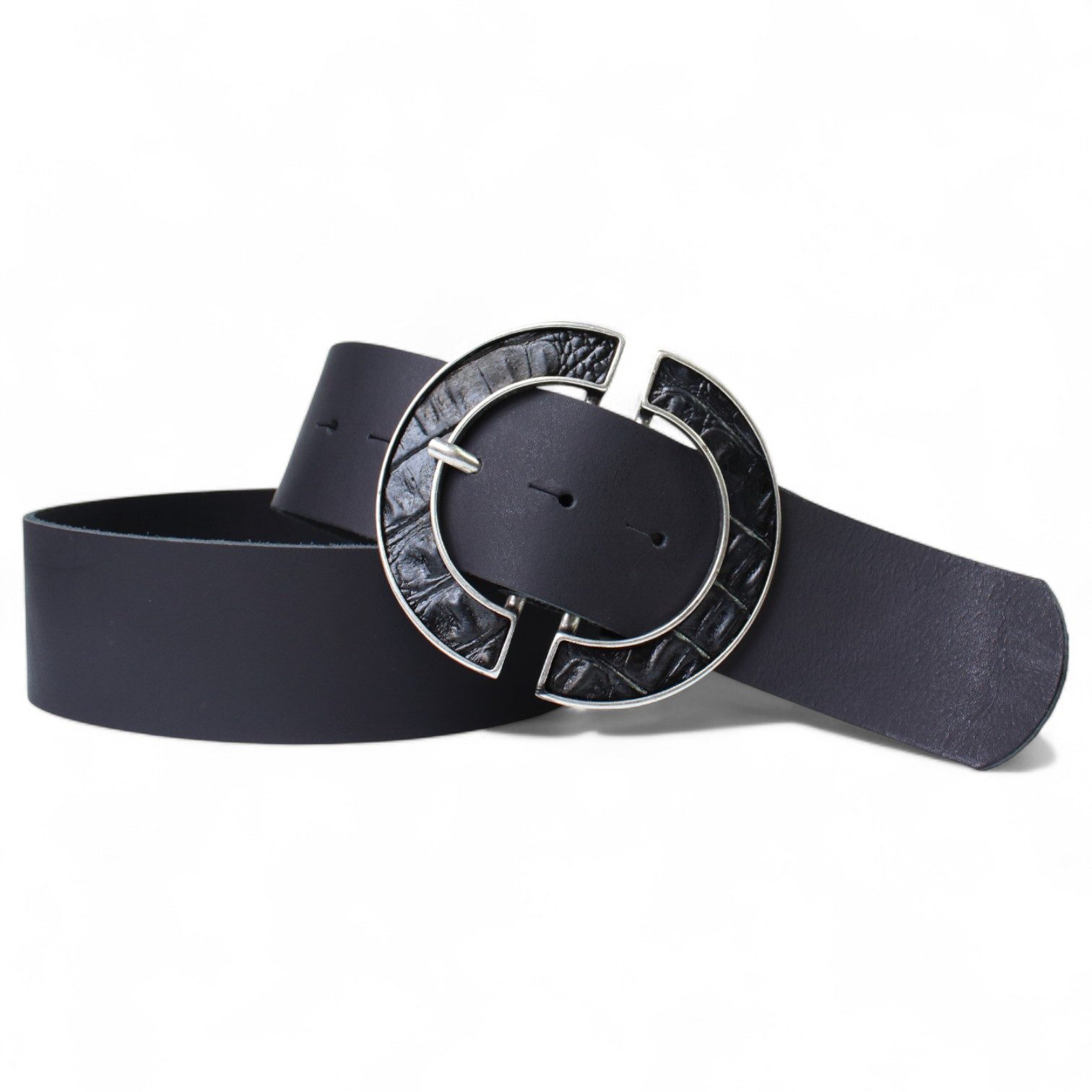 Schnalle und Optik – Die mattsilberne Dornschnalle ist mit einem eingelegten Kroko-Optik Lederstreifen versehen; die Schnalle misst ca. 10,5 × 9 cm und gibt dem Gürtel einen klaren Akzent.