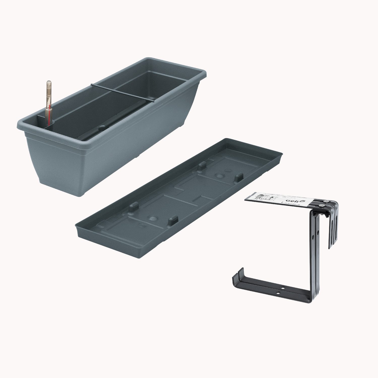 Der schöne und bewährte Blumenkasten Toscana mit Bewässerungssystem und Untersetzer im Set mit dem passendem Halter.