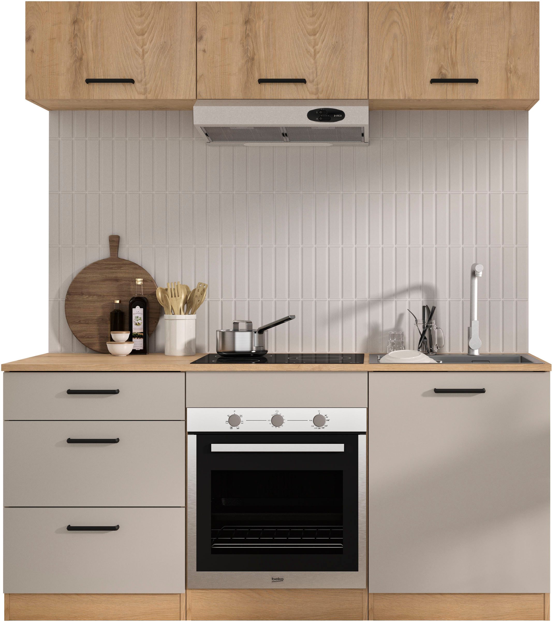 | Set beinhaltet | Arbeitsplatte 180 Backofenunterschrank B. 60 cm Oberschrank über Dunstabzugshaube, 1 Tür B. 60 cm Topf-/Kochgeschirrschrank mit 3 Schubladen B. 60 cm Unterschrank 1 Tür B. 60 cm |