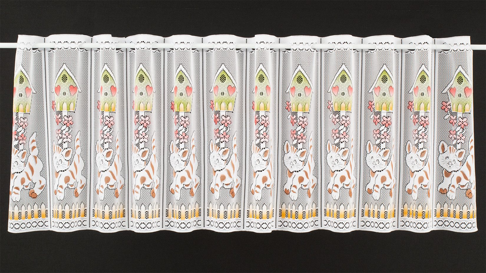 Scheibengardine Vogelhaus und Katze 45 cm hoch weiß - Wunschbreite frei wählbar durch gekaufte Menge in 14 cm Schritten - Meterware