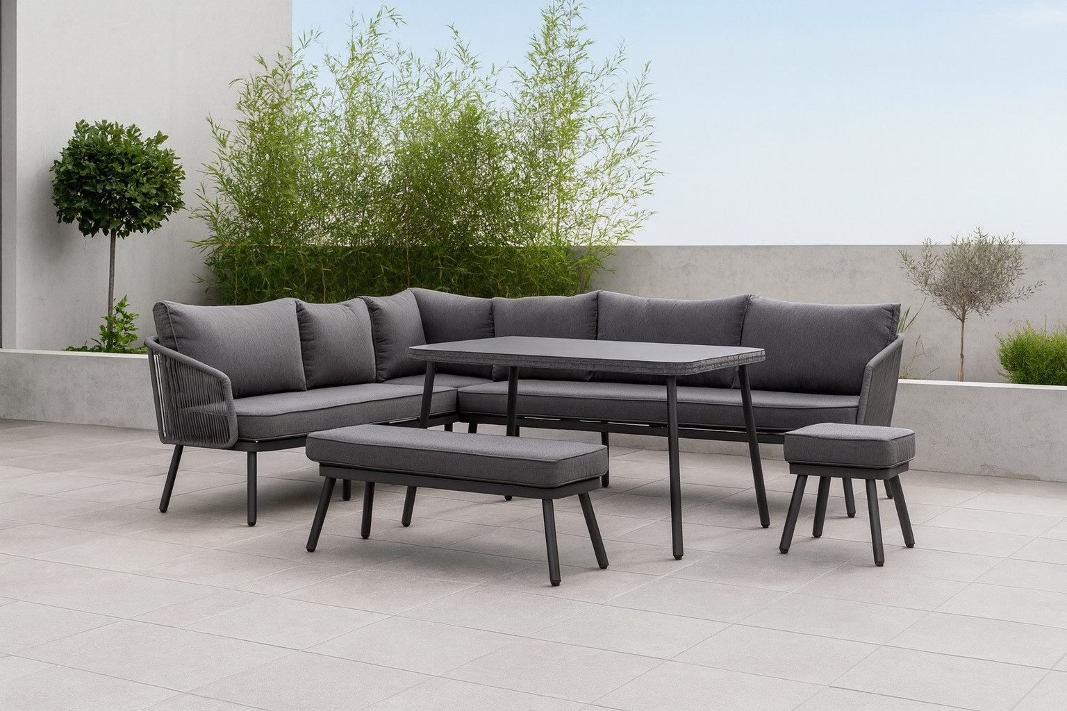 | Lieferumfang | Ecklounge inkl. Kissen Tisch Bank inkl. Auflage Hocker inkl. Auflage |