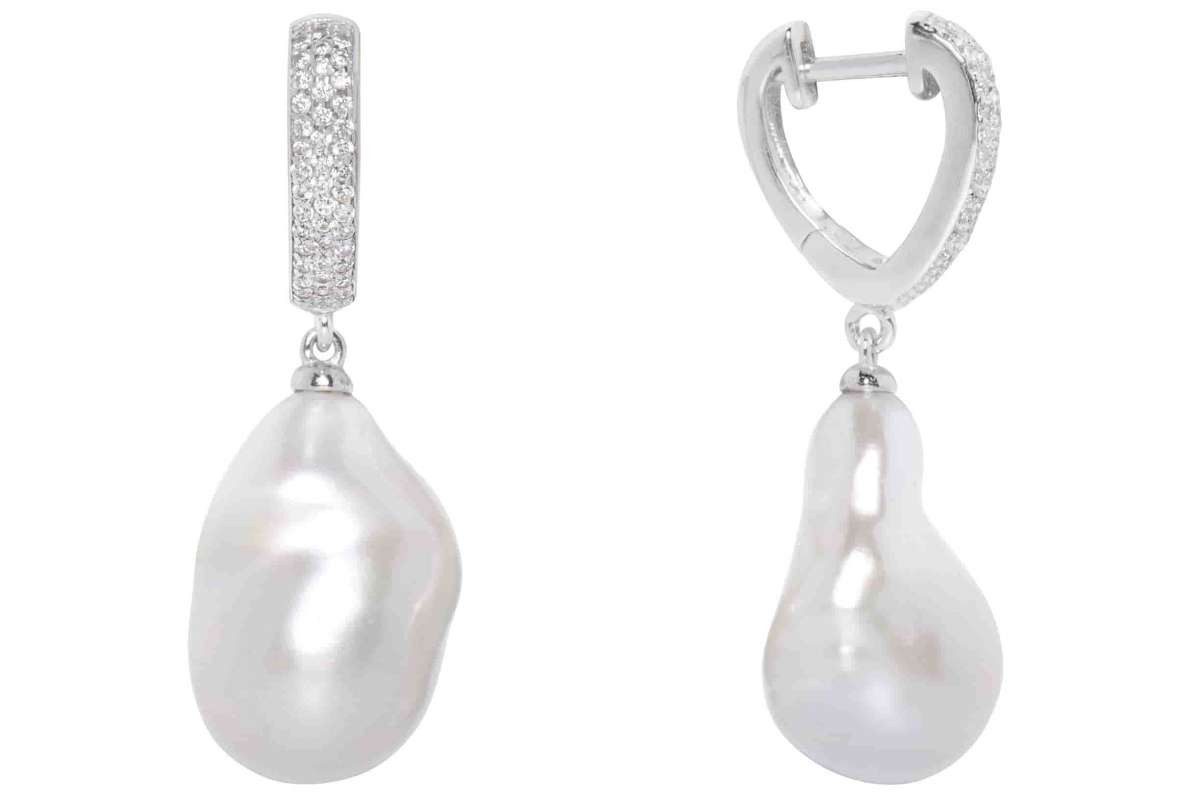 Dieser besonders elegante Ohrring, gearbeitet mit einer besonders großen barockförmigen handverlesenen weißen Perle, ergänzt um strahlenden Zirkonia am Verschluss, ist ein echtes Markenprodukt von Gaura Pearls, Estland.
