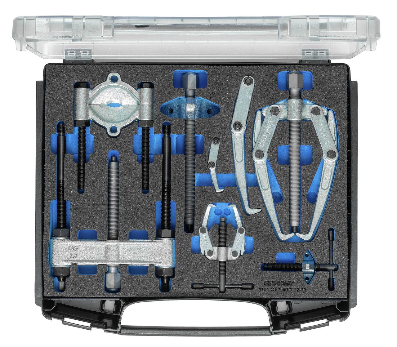 2- und 3-armige Trenn- und Aussenabzieher mit selbstanpressenden Haken , Zum Abziehen von dicht aufsitzenden Kegelrollenlager, Kugellager, Innenlaufringen, Batterieklemmen und anderen dünnwandigen Teilen bis max.Duchmesser 70 mm und einer Einbautiefe von max. 125 mm, Made in Germany, Trennmesser beidseitig verwendbar, Die Abziehvorrichtung kann mit weiterem Zubehör wie z.B. 1.81/10 Adaptern erweitert werden, Flexibel einsetzbar durch 2- und 3-armige Komponenten, Mit Check-Tool-Einlage für das schnelle Erkennen von fehlendem Werkzeug, Einlage in Schubladen mit den Mindestmaßen 340 x 260 x 65 mm verwendbar, Werkzeuge komplett im Schaumstoff versenkt, somit ist die bestückte Einlage stapelbar, In GEDORE i-BOXX® 72 No. 1101 L, Maße: B 367 x T 316 x H 72 mm