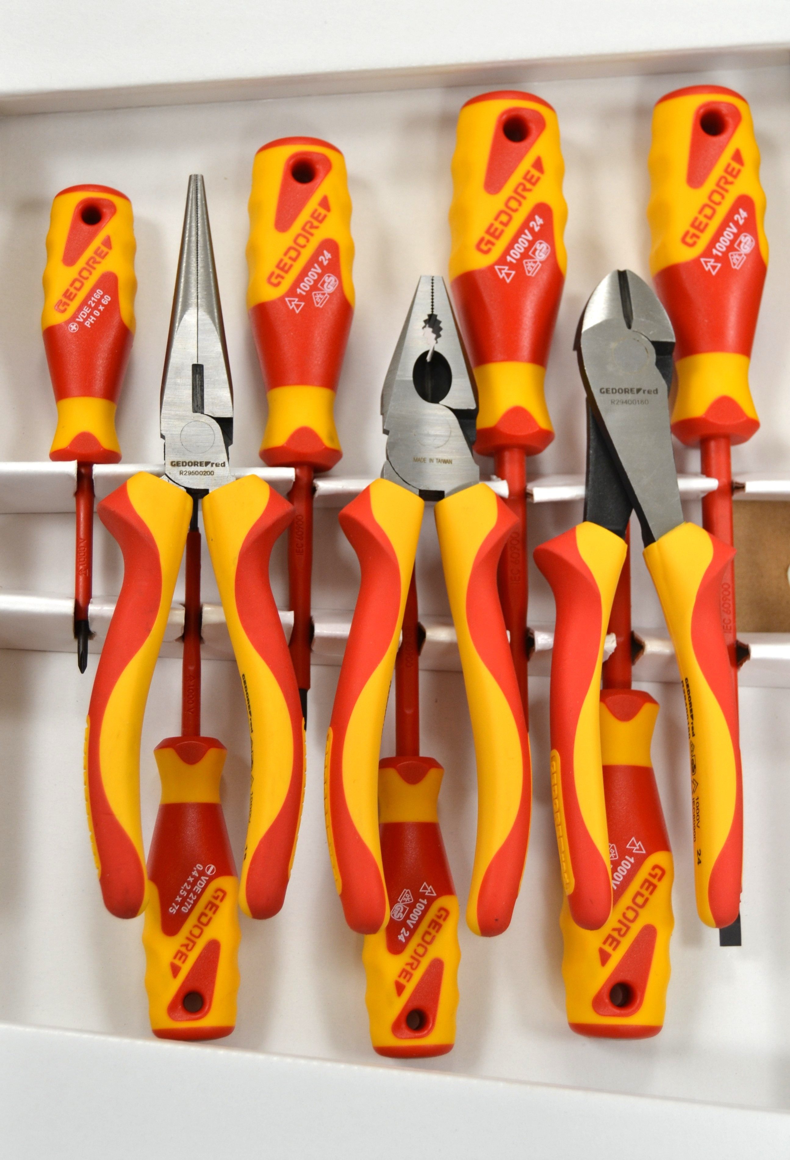 | Set beinhaltet | Gedore VDE Schraubendreher Satz 7-tlg IS 2,5-6,5 PH 0-2 - VDE 2170-2160 PH-077, Gedore VDE Kombizange L.180mm 2K-Griff - R29300180, Gedore VDE-Flachrundzange L.200mm 2K-Griff - R29500200, Gedore VDE-Seitenschneider L.180mm 2K-Griff - R29400180 |