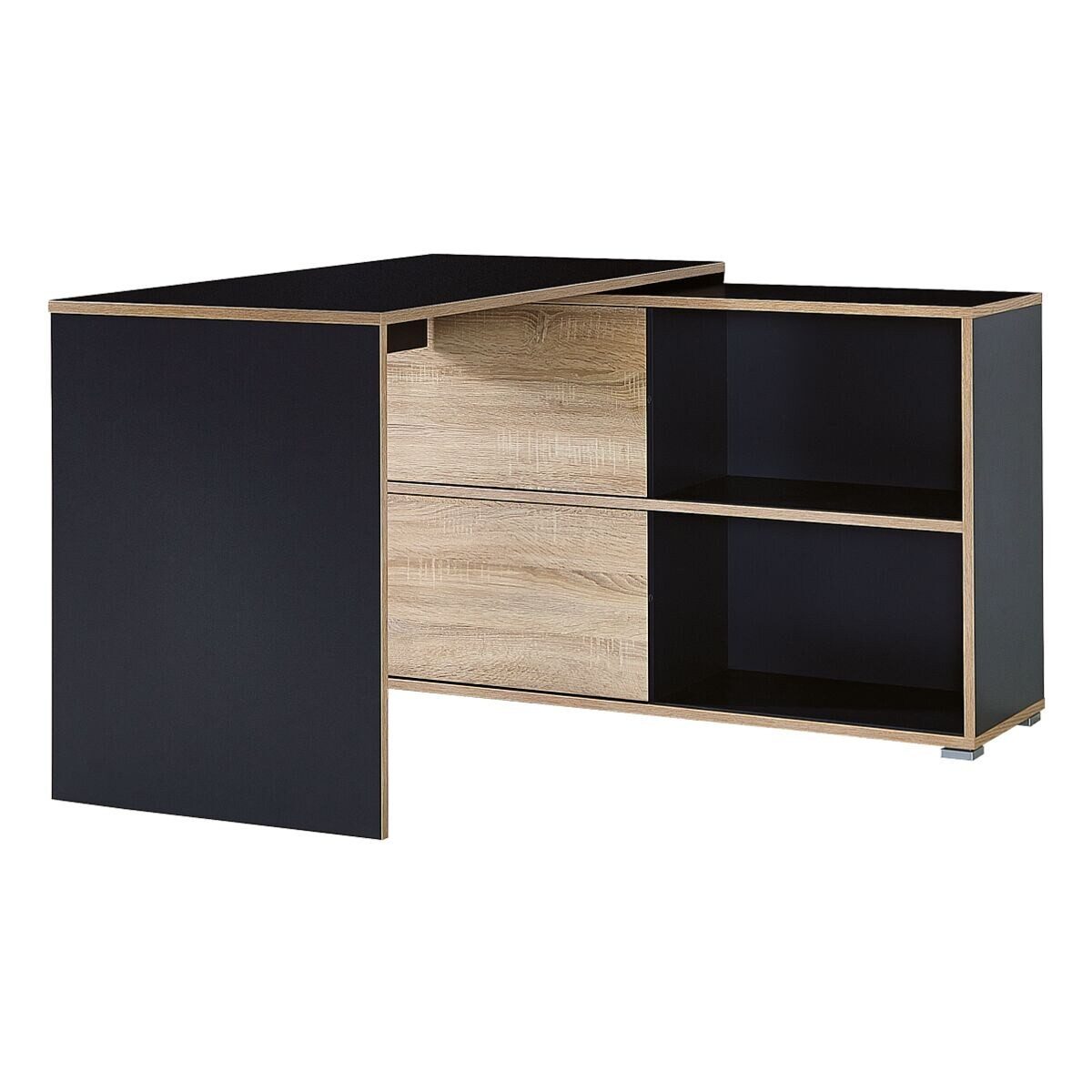 Kompakter Schreibtisch mit integriertem Regal und wendbaren Schiebetüren