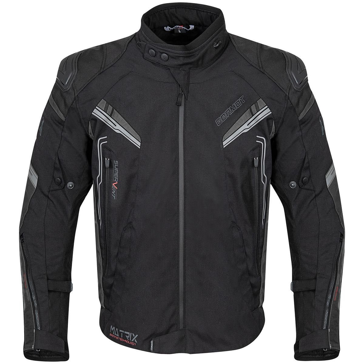 Textiljacke Matrix für Herren. Der neue Blouson ist nicht nur optisch ein echter Hingucker, sondern hat auch einen sportlichen Schnitt. Die Kurzjacke ist perfekt für sportliche Fahrten geeignet und bringt viele Funktionen mit sich. Eigenschaften: wasserdicht, winddicht, atmungsaktiv, abriebfestreißfest. Ausstattung: Klimamembrane; YF Protektoren an Schultern und Ellbogen, zertifiziert nach EN 1621-1, herausnehmbar; soft Schulterschalen; Spezialschaumeinlage im Rückenbereich, herausnehmbar; Forcefield Rückenprotektor, nachrüstbar - zertifiziert nach EN 1621-1 oder EN 1621-2; herausnehmbares Innenfutter; Stretcheinsatz im Rücken- und Armbereich; Ober- und Unterarmweitenregulierung; flexibler Snap Softkragenverschluss; Belüftungsreißverschlüsse; rundum Verbindungsreißverschluss; Sicherheitsnähte; reflektierendes Material; zwei Außentaschen; zwei Innentaschen; Handytasche. Material: Obermaterial: 100% Polyamid; Futter: 100% Polyester; Thermofutter: 100% Polyester; Membranträger: 100% Polyester, Membrane 100% Polyurethan laminiert. Weitere Farben: schwarz/gelb, schwarz/grau, schwarz/grün