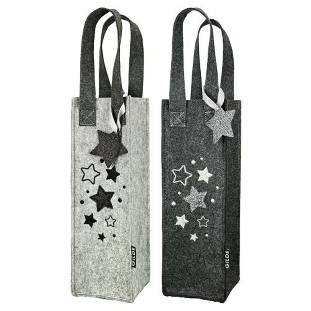 Hochwertige Filztaschen Sternenschauer in hellgrau und dunkelgrau mit glänzenden Sternen. Die Filztaschen haben zwei Henkel und sind ideal als Geschenktaschen, besonders für Flaschen in der Weihnachtszeit zu benutzen. Auch als Aufbewahrungstaschen oder als Dekoration sind sie wunderschö;n. Die Filztaschen haben eine Größe von 30x10x10cm. Die Flaschentaschen werden im 2er Set geliefert.