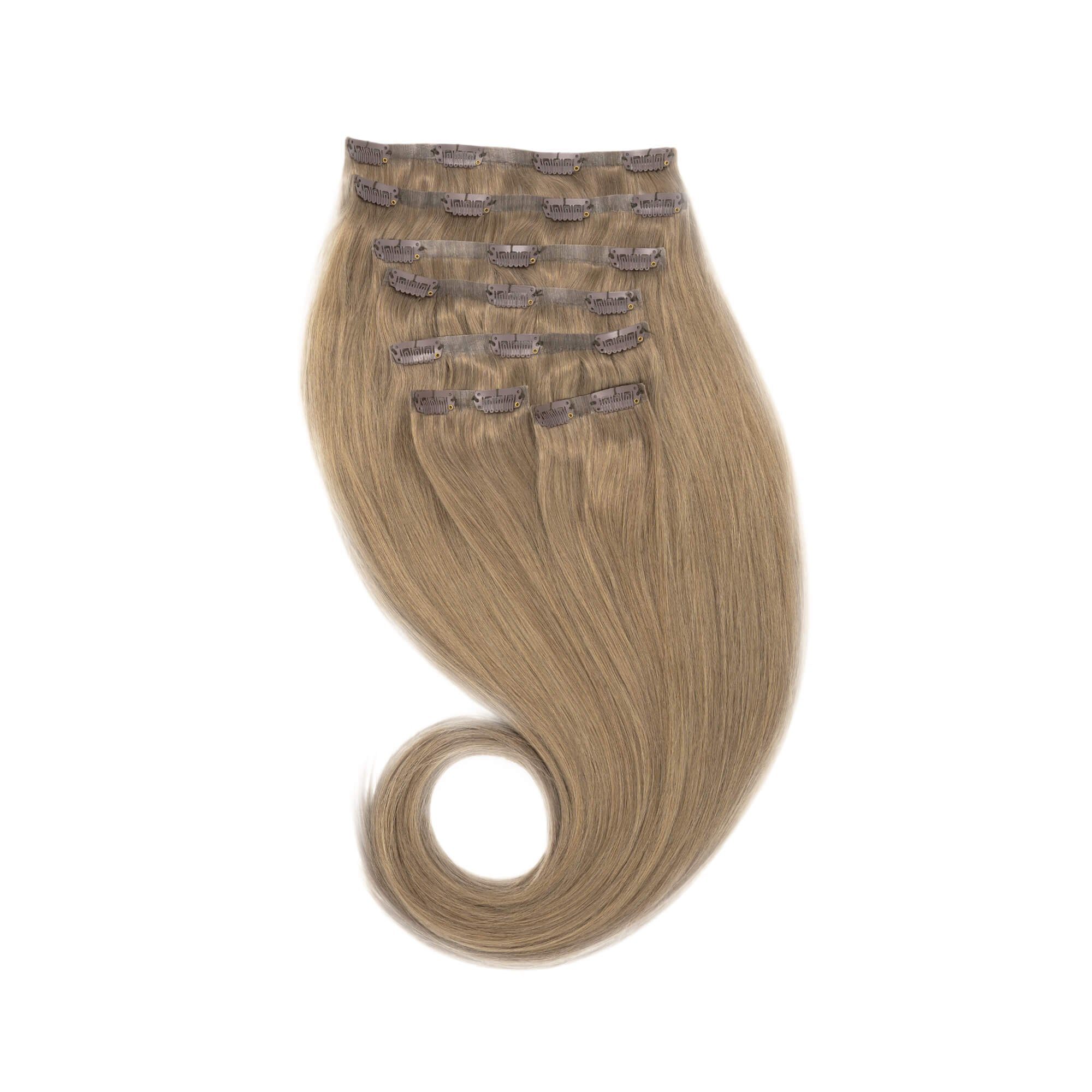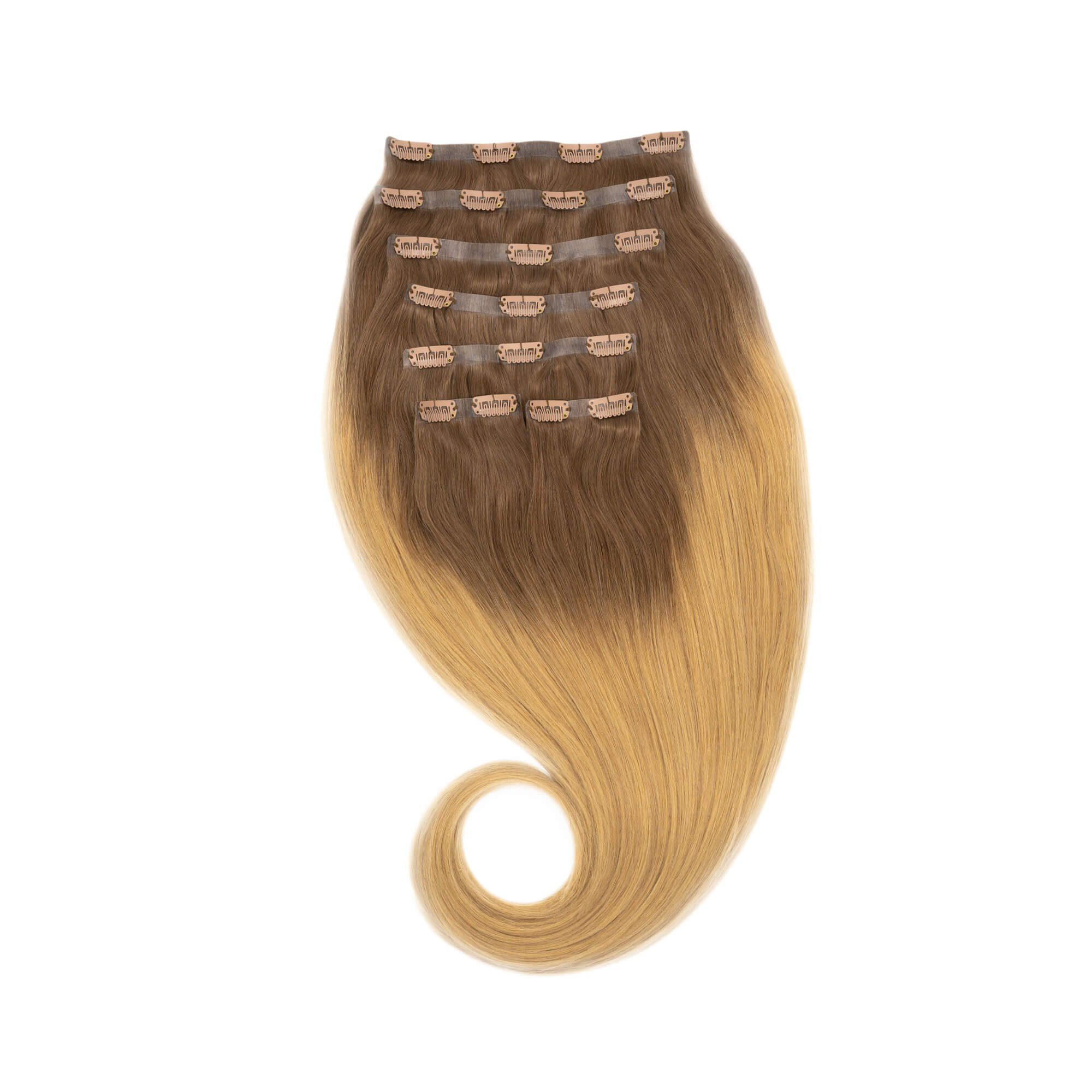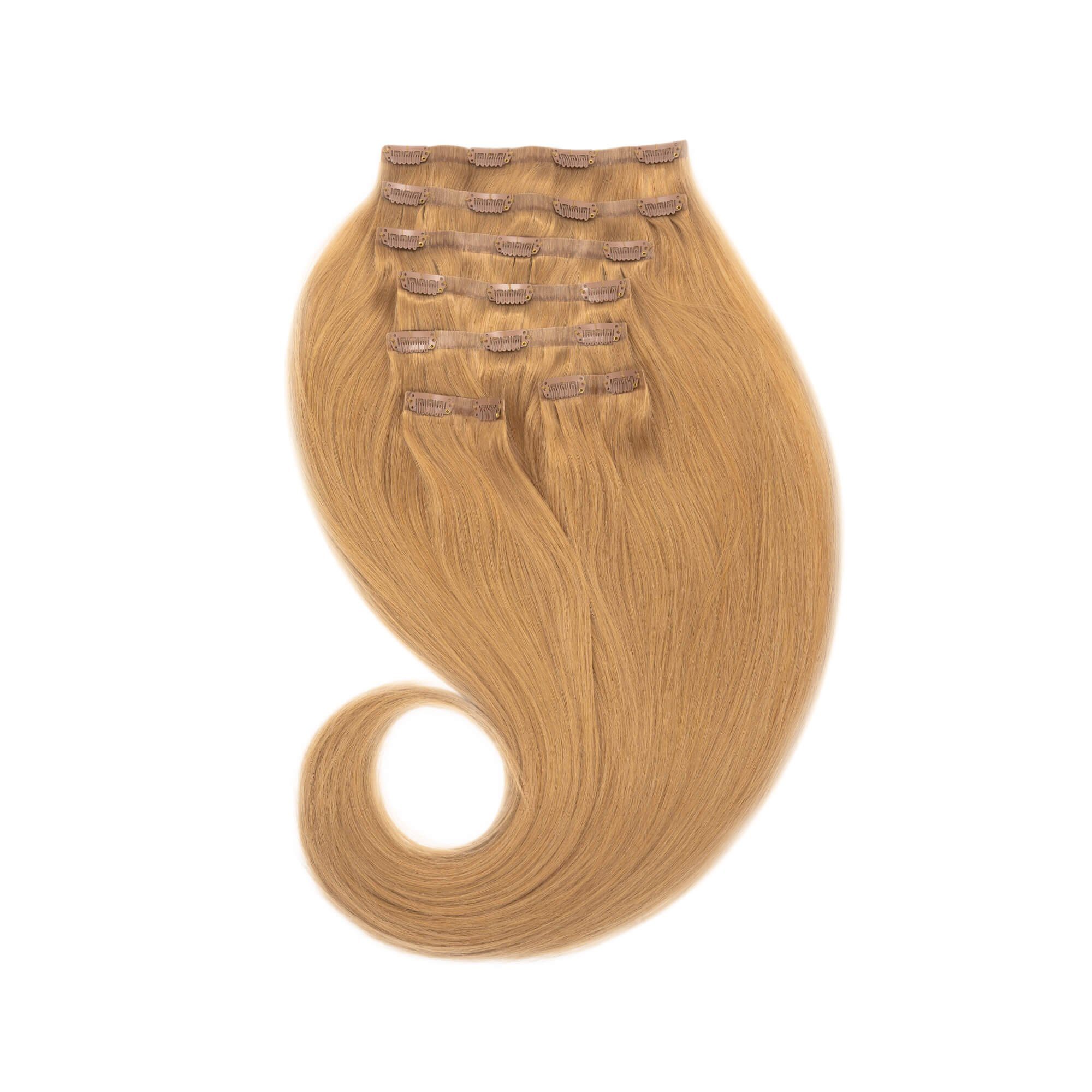 Hollywood Extensions / Nahtlose Clip-in-Extensions. Jetzt mit noch mehr Haarvolumen! Dadurch, dass keine Fäden zum Halten der Haare benutzt werden enthält eine Tresse fast doppelt so viel Haar wie eine Vernähte, das Haarteil liegt flach an und verliert keine einzelnen Haare. Diese Clip-in-Extensions bieten wir in Vier Längen an. Mit diesem luxuriösen Volumen reicht ein Set auch bei dichtem Eigenhaar für die komplette Haarverlängerung. Die Extensions haben keine Unterlängen und sind somit voll bis in die Spitzen.