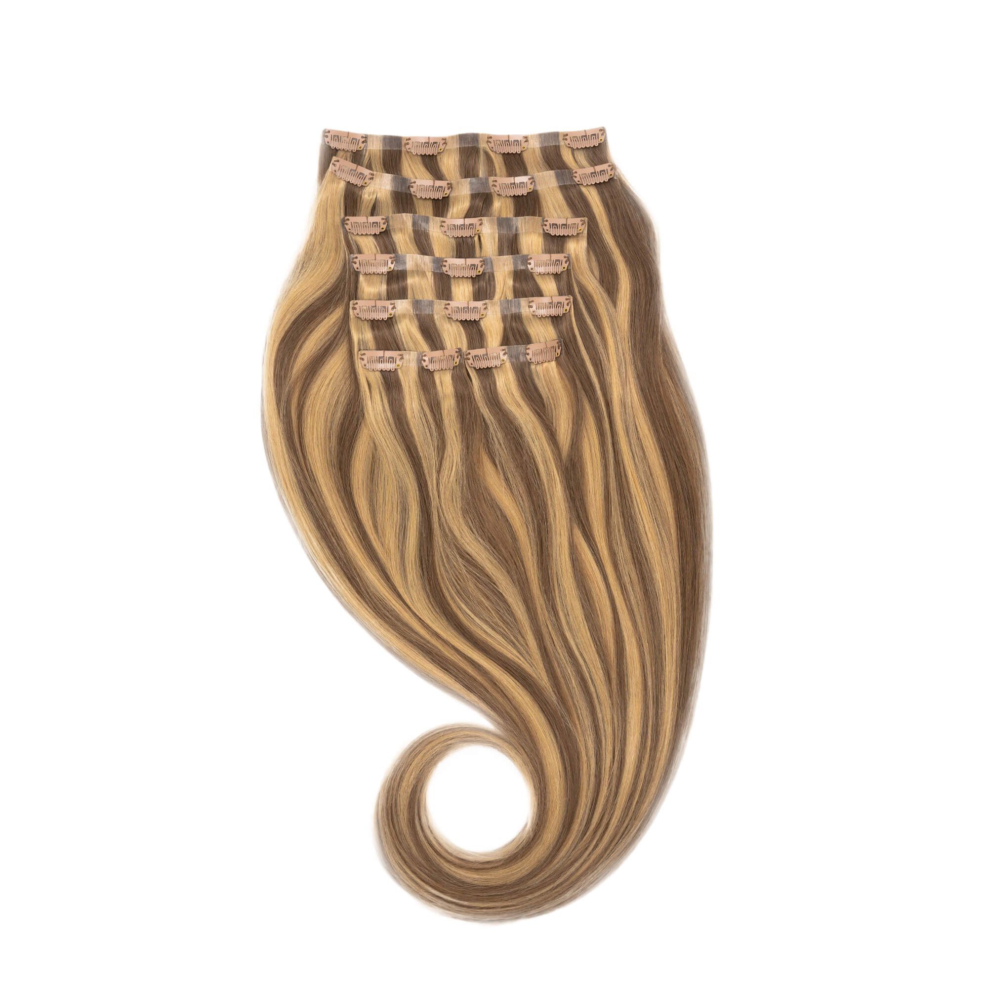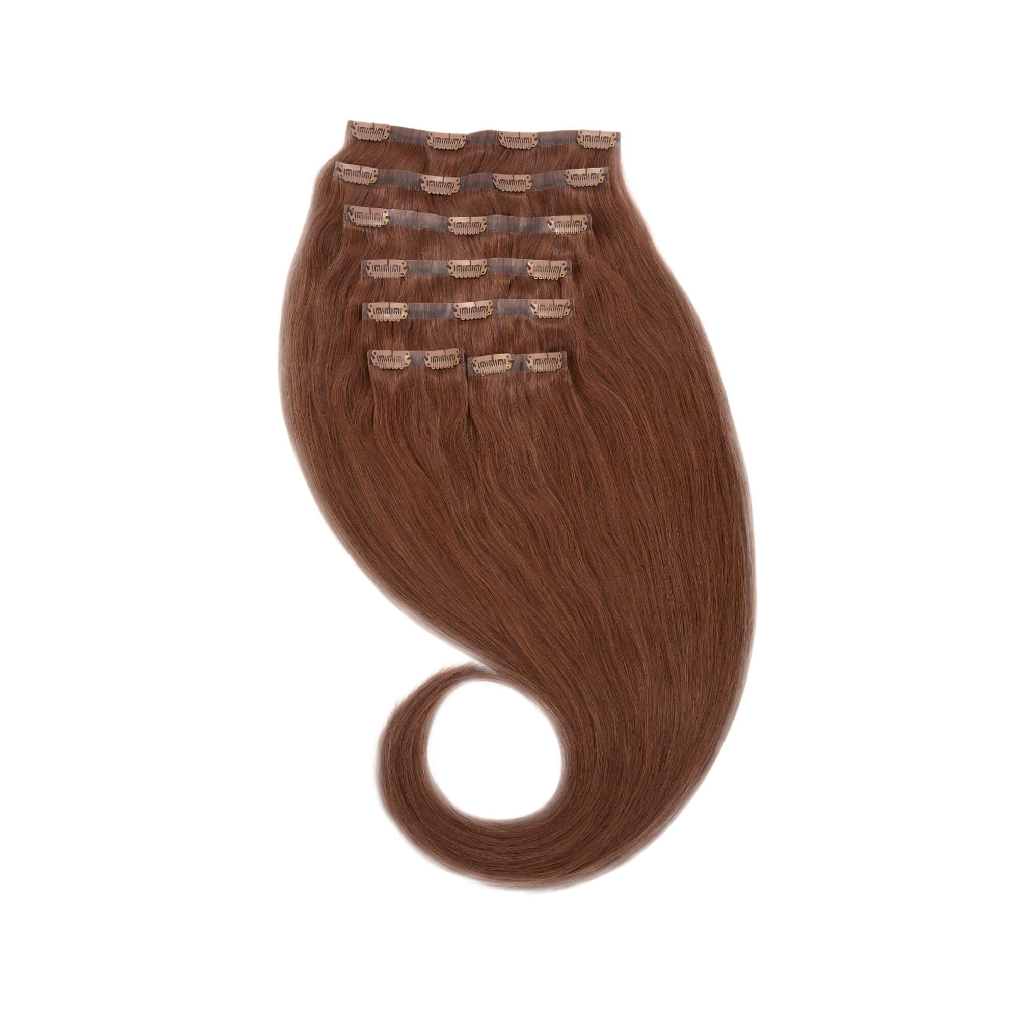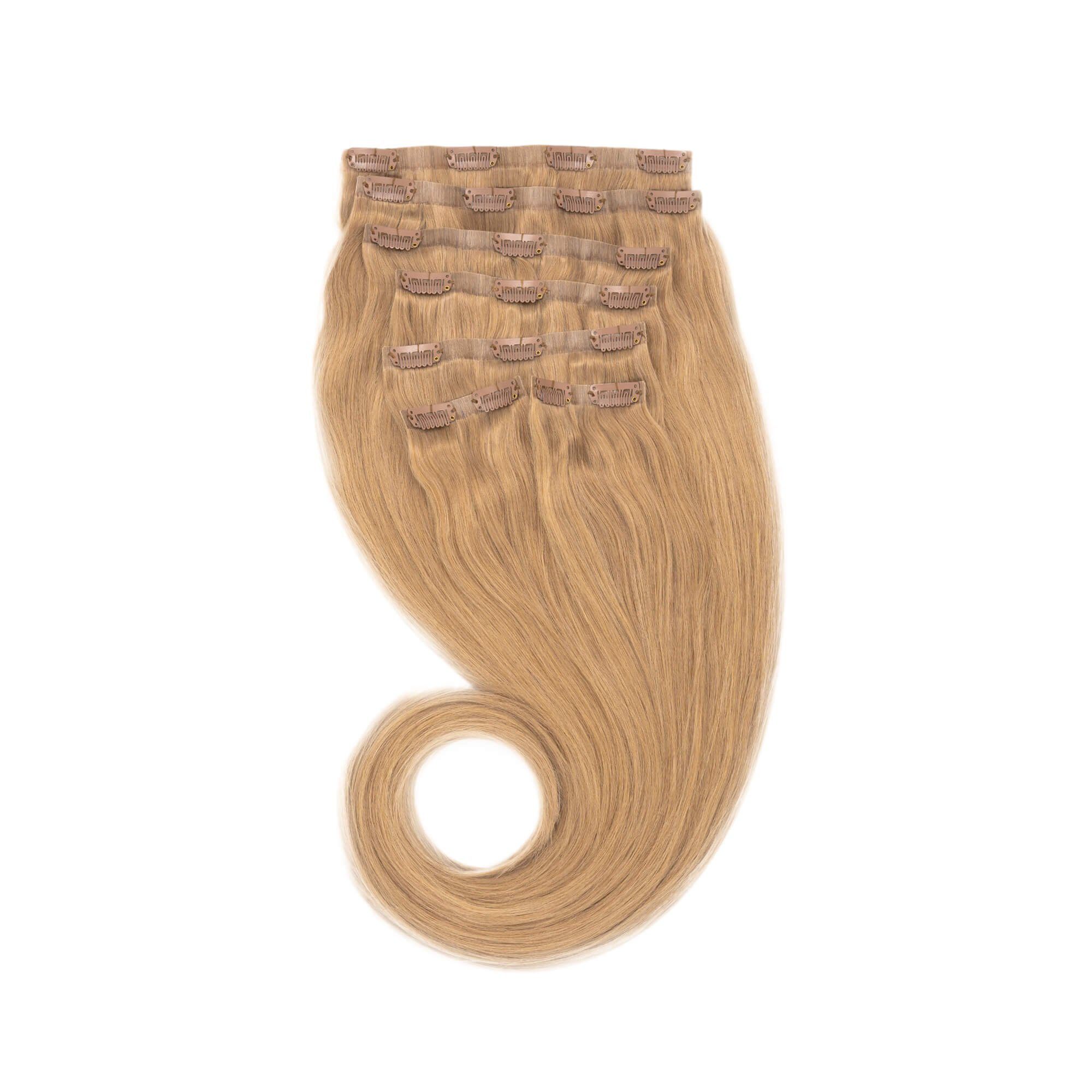 Hollywood Extensions / Nahtlose Clip-in-Extensions. Jetzt mit noch mehr Haarvolumen! Dadurch, dass keine Fäden zum Halten der Haare benutzt werden enthält eine Tresse fast doppelt so viel Haar wie eine Vernähte, das Haarteil liegt flach an und verliert keine einzelnen Haare. Diese Clip-in-Extensions bieten wir in Vier Längen an. Mit diesem luxuriösen Volumen reicht ein Set auch bei dichtem Eigenhaar für die komplette Haarverlängerung. Die Extensions haben keine Unterlängen und sind somit voll bis in die Spitzen.