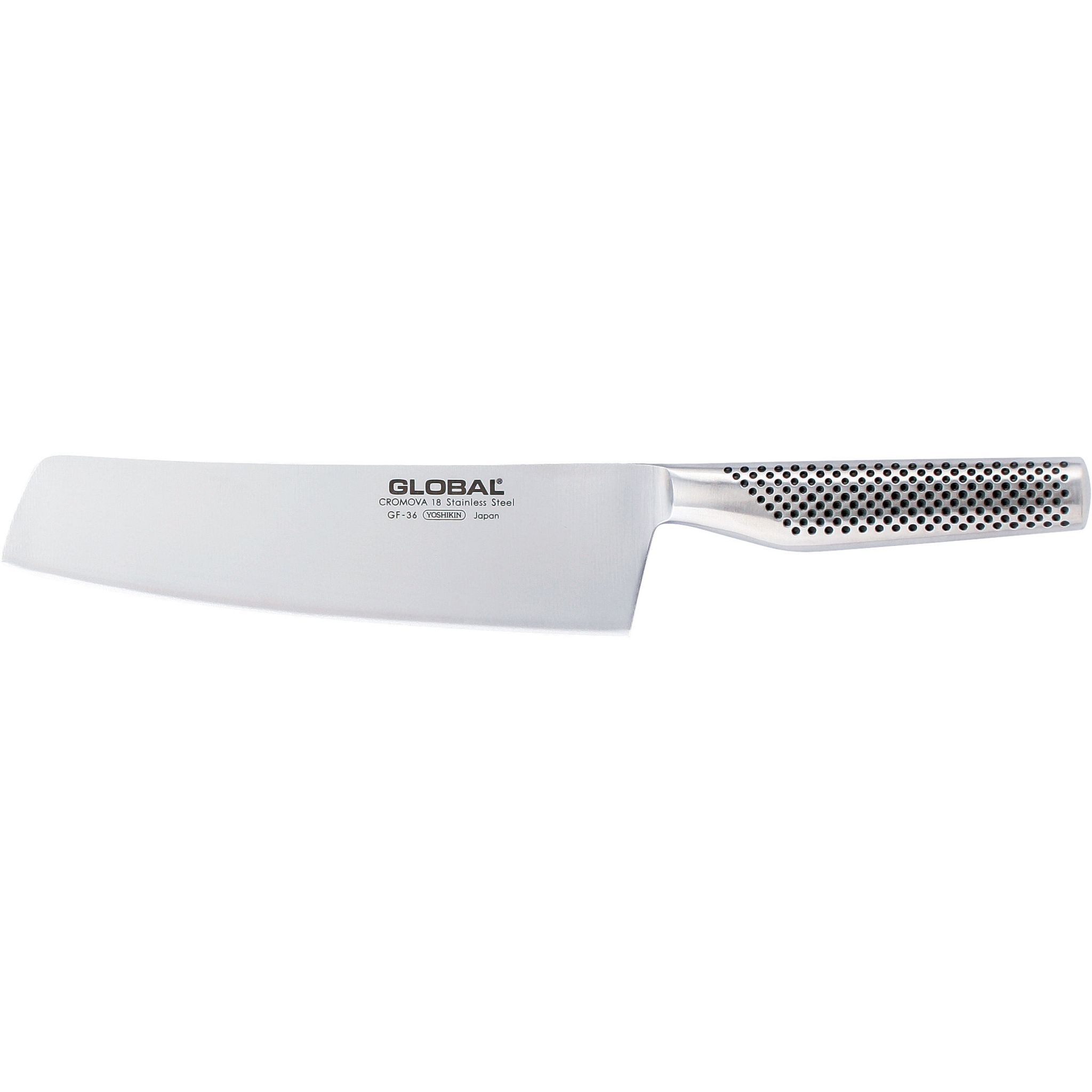 Das GF-36 Global Yoshikin Gemüsemesser hat eine geschmiedete Ausführung. Es ist mit seiner 20 cm langen Klinge für alle Zwecke in der Küche geeignet. Das traditionelle, japanische Allzweckmesser (Santoku) ist das beliebteste Messer in Japan. Es eignet sich aber eben so gut für die europäische Küche. Da es sich um ein hochwertiges Kochmesser handelt, ist es nicht zum Hacken von Knochen, Knorpeln, Gefrorenem o.ä. zu verwenden. Bitte verwenden Sie nur weiche Schneidunterlagen wie Holz oder Kunststoff nutzen.