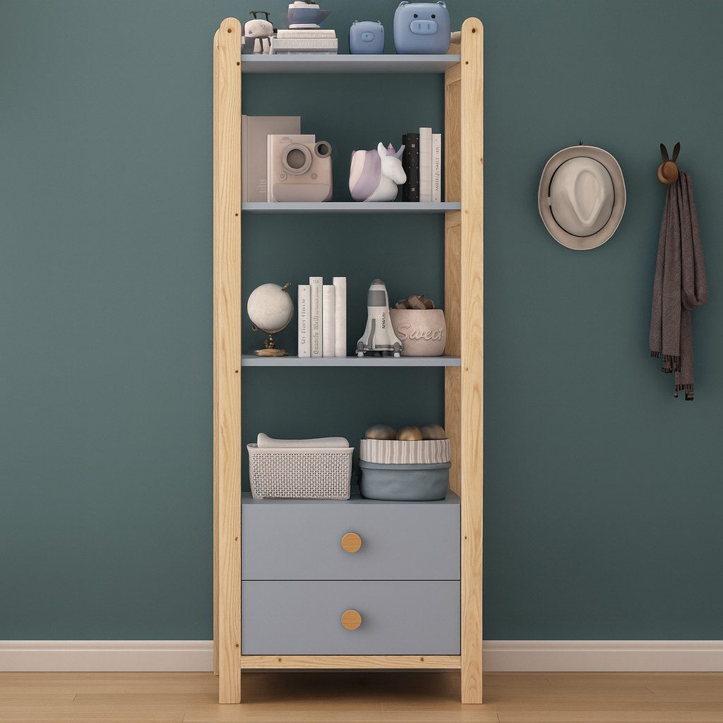 Standregal, Bücherregal, Regal mit Schubladen, Holzregal, Aufbewahrungsregal, Kiefernholz Regal, Regal blau Holz, Wohnzimmer Regal, Schlafzimmer Regal, modernes Regal, skandinavisches Regal, Holzmöbel, Stauraumregal, Bücherregal mit Stauraum, Regal mit Vollholzgriffen, Dekoregal