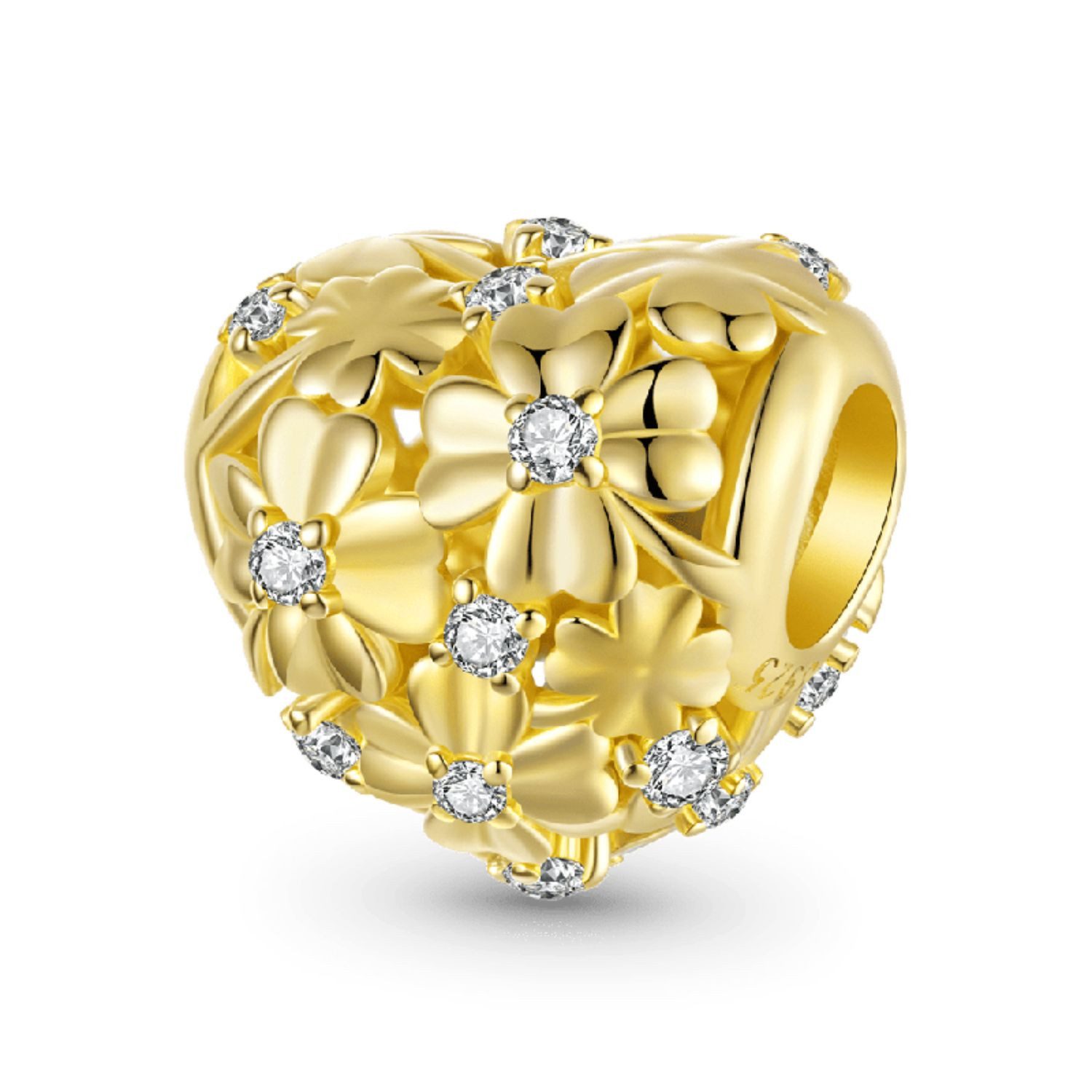 Tragen Sie ein Symbol der Hoffnung und Erneuerung mit dieser exquisiten Gnoce Kleeblatt Herz Charm. Diese einzigartige herzförmige Perle wurde sorgfältig aus S925 Sterlingsilber mit einer glänzenden Goldbeschichtung gefertigt und verfügt über zarte Kleeblattmotive, die mit funkelnden Zirkonsteinen akzentuiert sind und die Symbolik der schönen Zyklen des Lebens verkörpern.