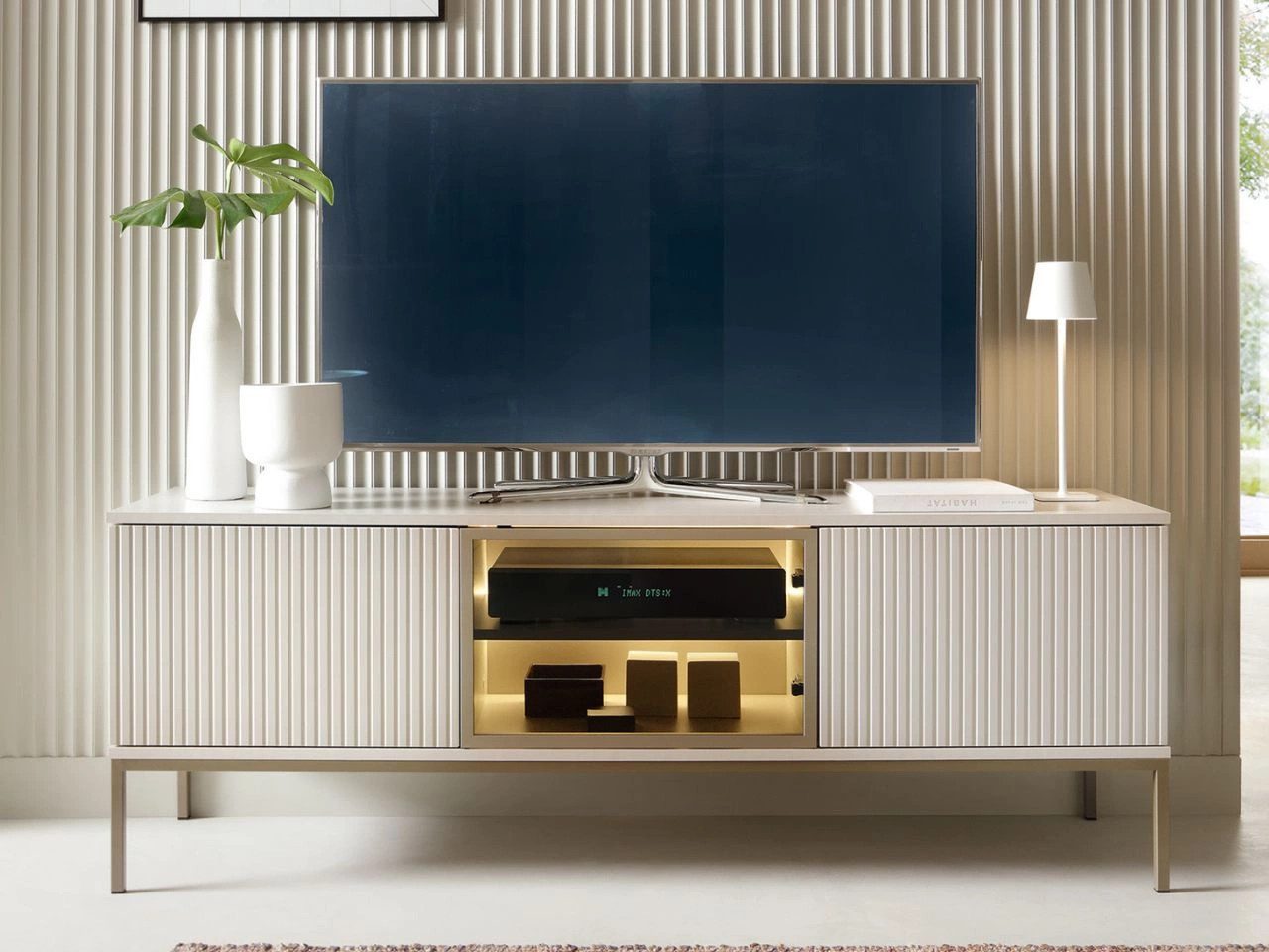 TV-Lowboard Deo – Kaschmir verbindet klaren Loft-Charme mit hoher Funktionalität. Drei Türen – eine davon mit gehärtetem Glas – bieten großzügigen Stauraum für Receiver, Konsolen und Zubehör.